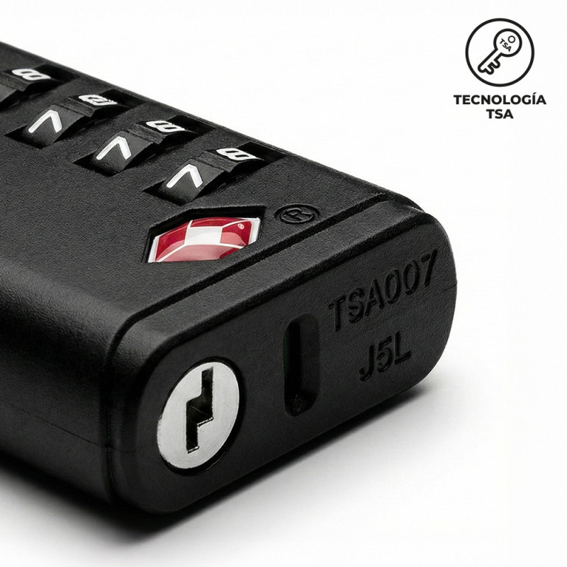 Candado en material ABS con clave de cuatro dígitos. Empaque Caja Individual. NOTA: La tecnología TSA permite que el candado sea abierto con una llave maestra sin ningún daño.