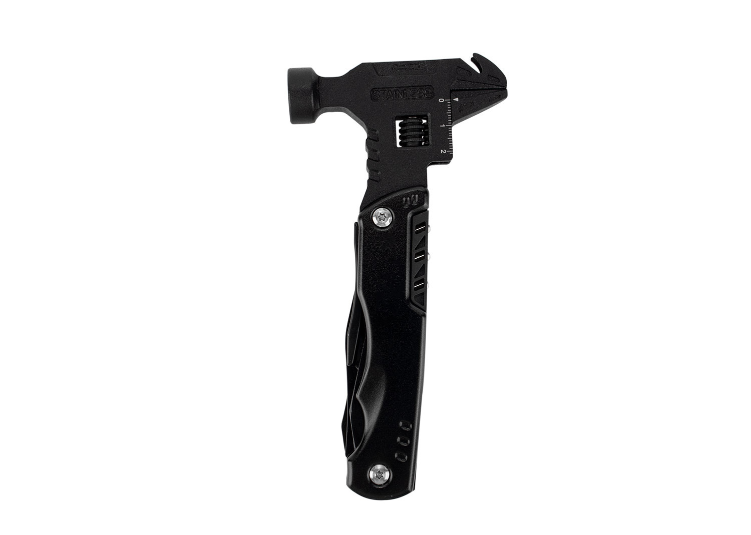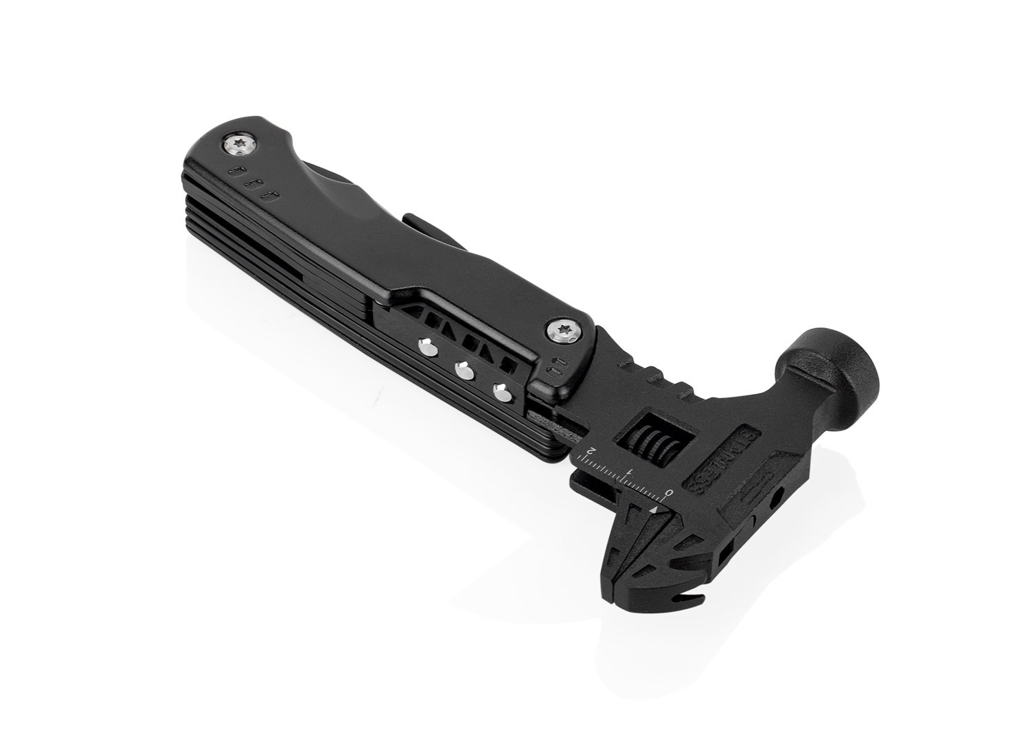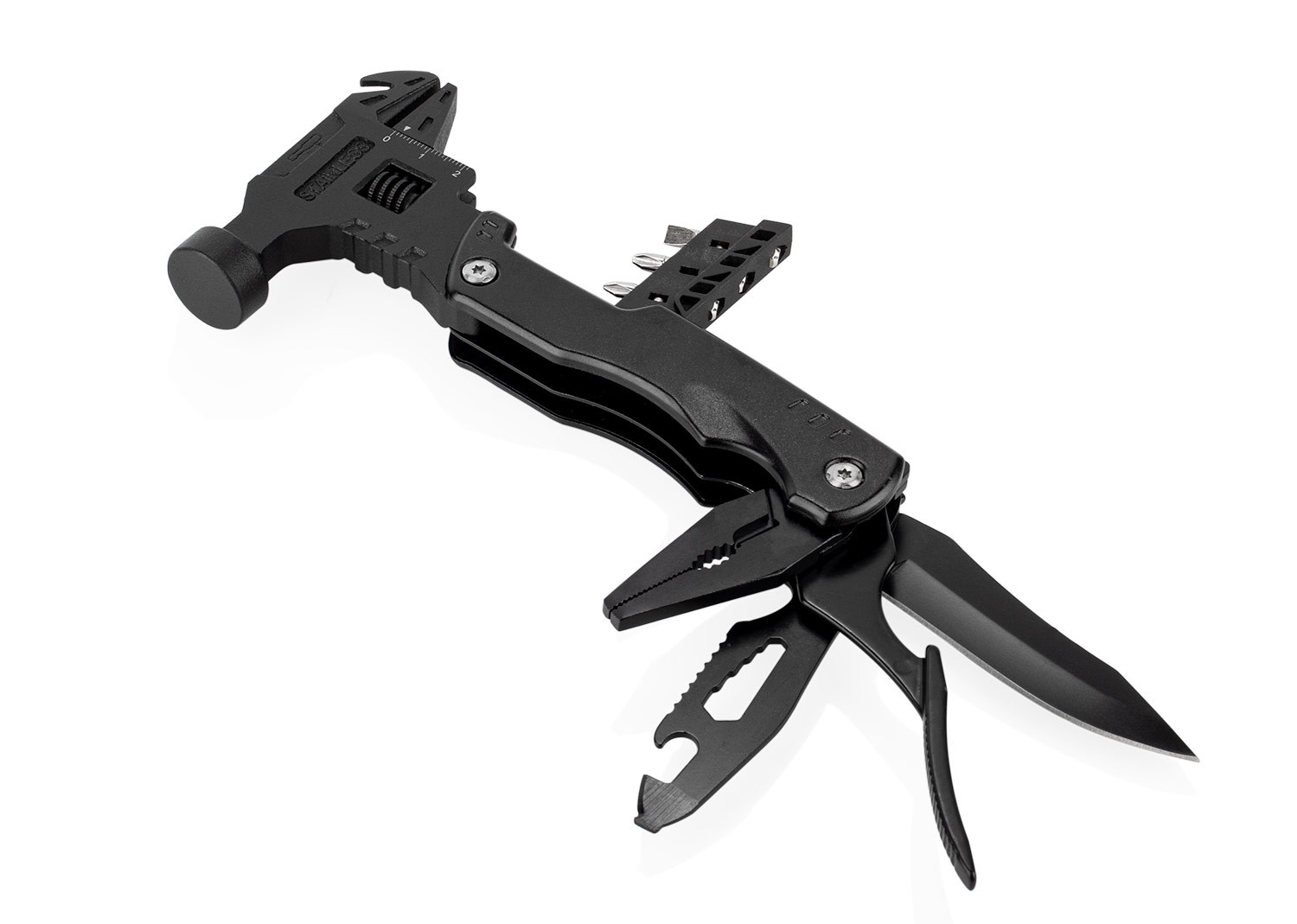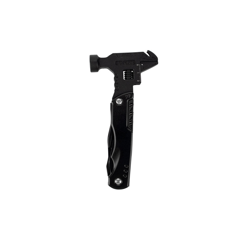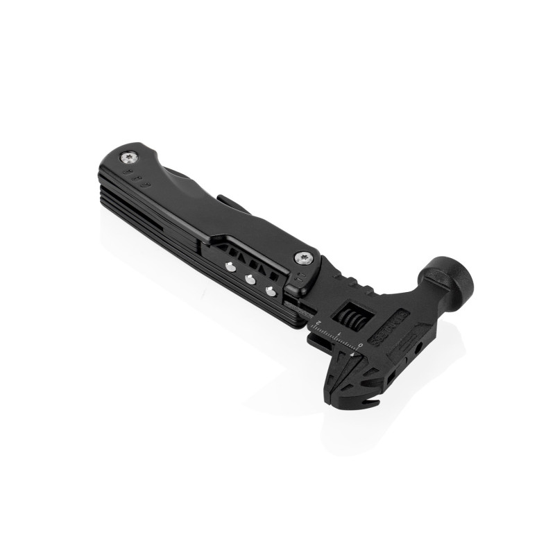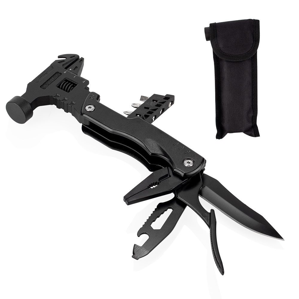 Esta herramienta multifunción integra en un solo cuerpo (8,5 X 26 X 2,4) compacto (8,5 X 16,9 X 2,4) una variedad de funciones esenciales: martillo y llave inglesa (8,5 X 17,8), extractor de clavos, tres tipos de destornilladores, cuchillo (2 X 18,8) y una herramienta adicional con destornillador de 3 mm, dos tipos de abrebotellas, sierra y cabeza hexagonal en cinco tamaños (2 X 18,8). También incluye una pinza con punta de aguja, pinza regular y cortador de alambre (2,2 X 17). Su diseño plegable permite un fácil almacenamiento y transporte, e incluye un estuche para mayor practicidad.
