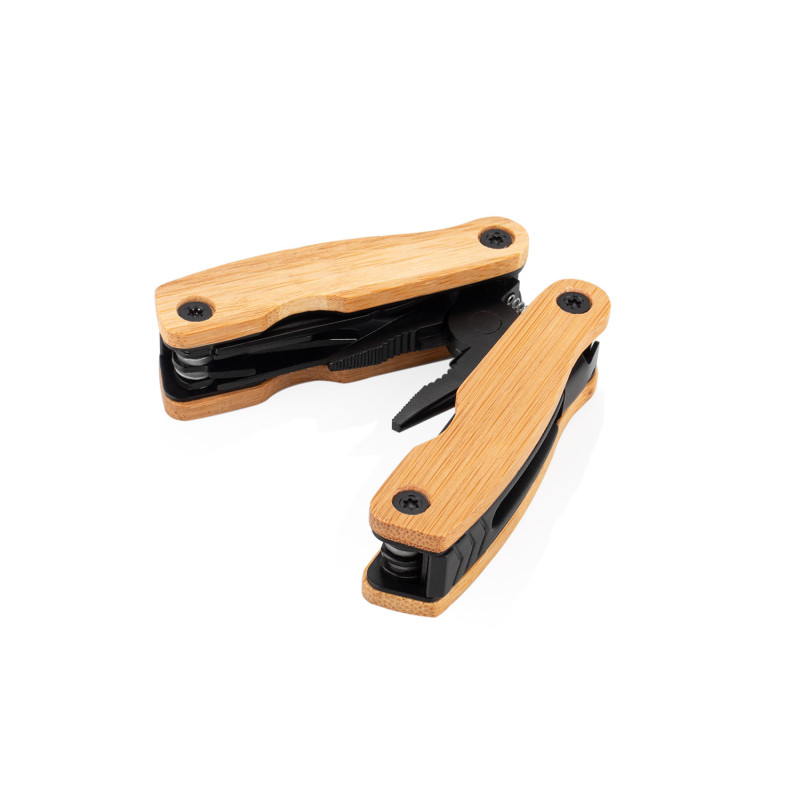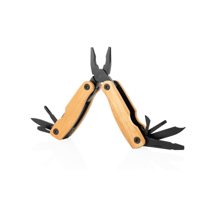 Esta herramienta multifunción cuenta con un diseño plegable y mango de madera, e integra alicates de punta fina y alicate regular (5,2 X 10,1), destornillador estrella (0,4 X 2,6) y pala (0,8 X 4), lima de uñas (0,8 X 3,6), abrelatas con removedor de ganchos, cuchillo (0,8 X 3,5), abrebotellas y sierra (0,6 X 3,6). Su formato compacto permite llevarla fácilmente y tener a la mano las funciones básicas para tareas cotidianas.