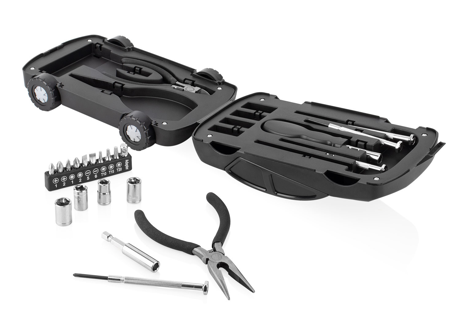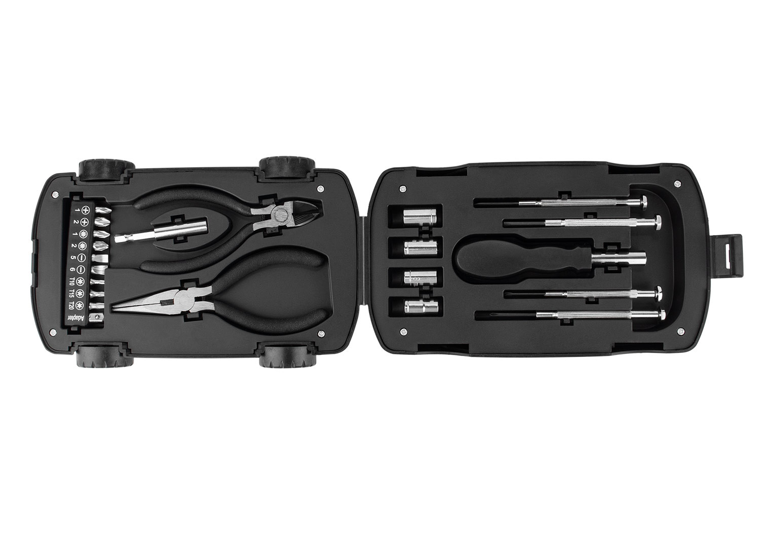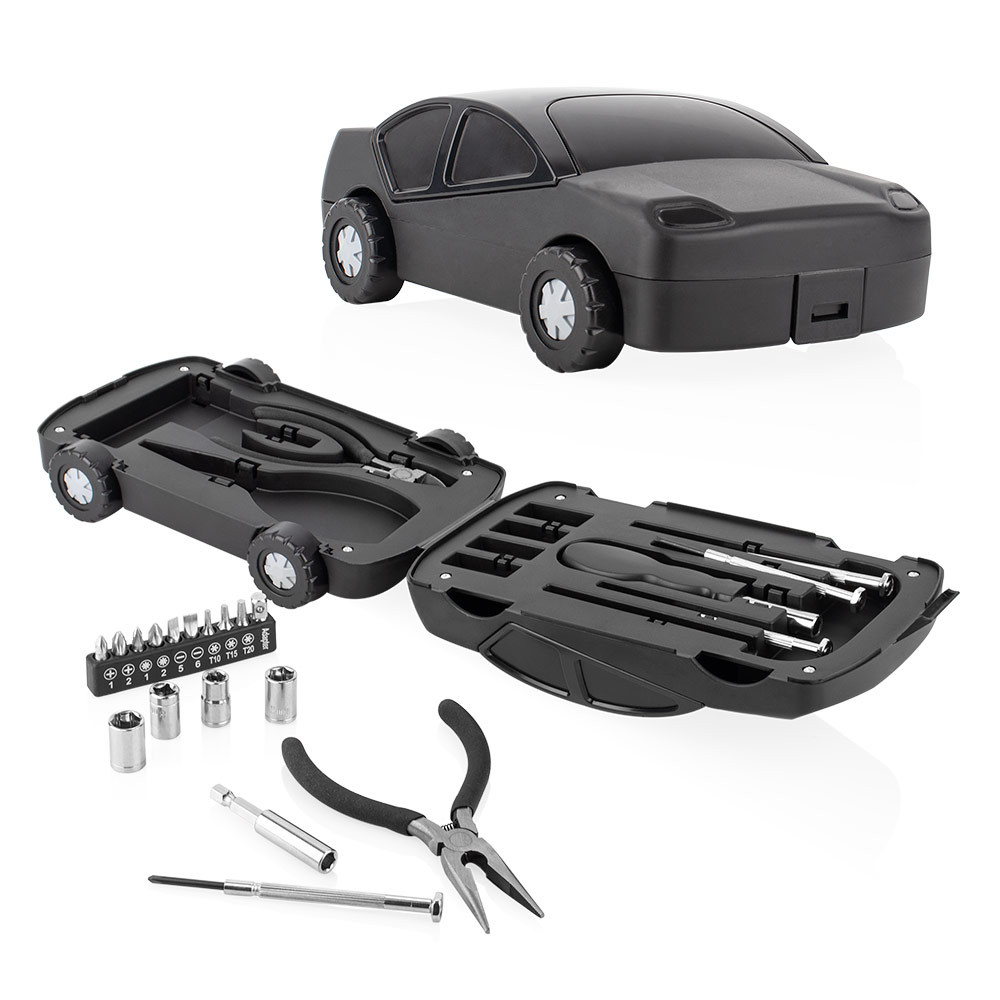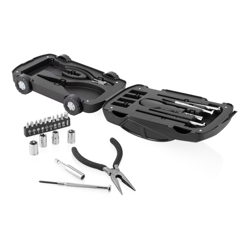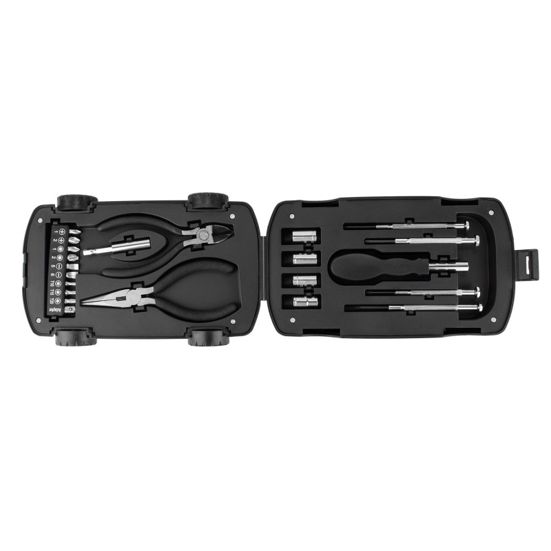 Este juego de herramientas viene en un estuche compacto con forma de automóvil, que incluye 4 piezas de precisión, un mango de destornillador (2,5 X 11,5), 4 copas (7 -10 mm), alicates en 2 piezas (punta y corte), un mango de junta (5,8 X Ø 0,6) y 10 puntas de destornillador. Su diseño práctico y organizado permite tener a la mano los elementos básicos para tareas de ajuste y reparación.