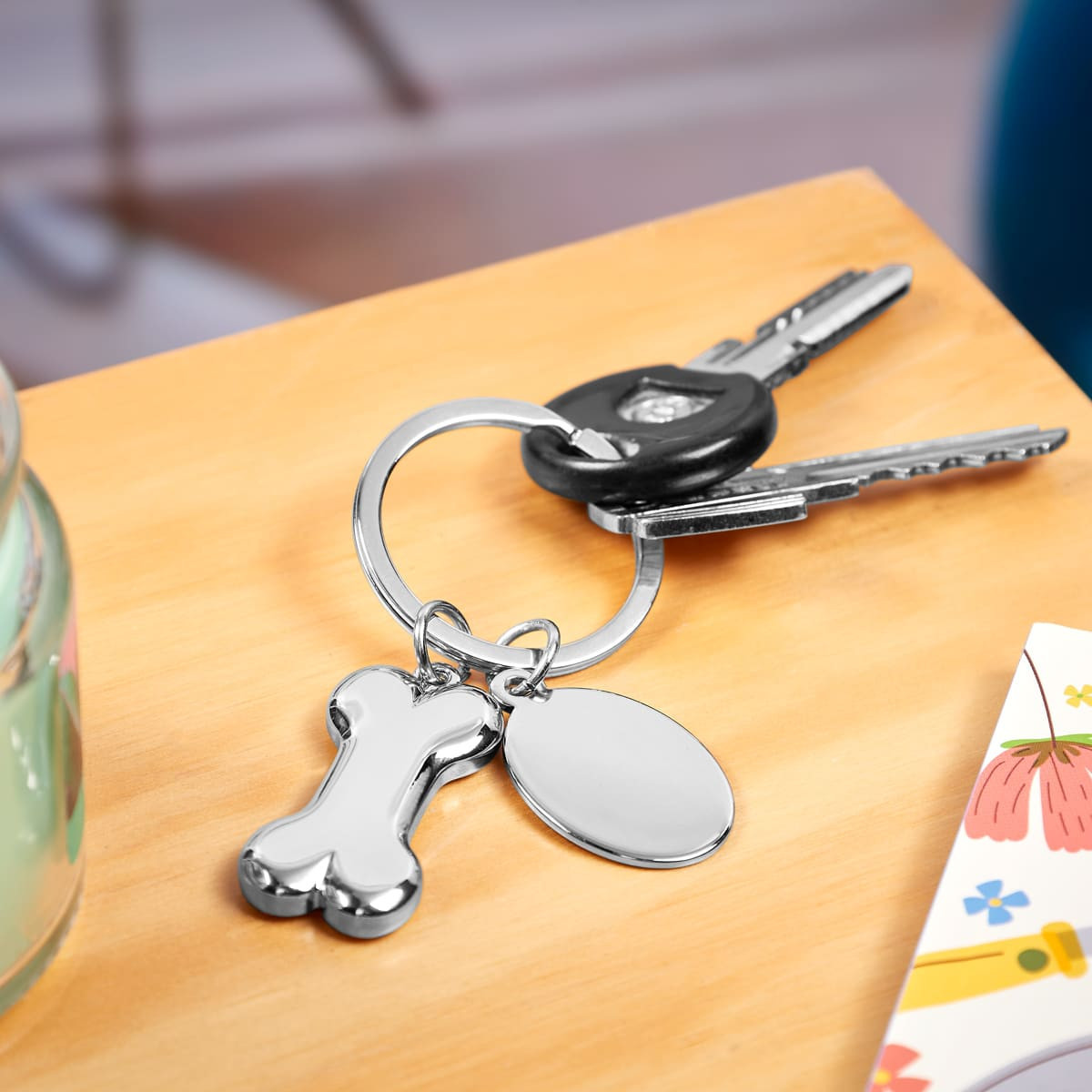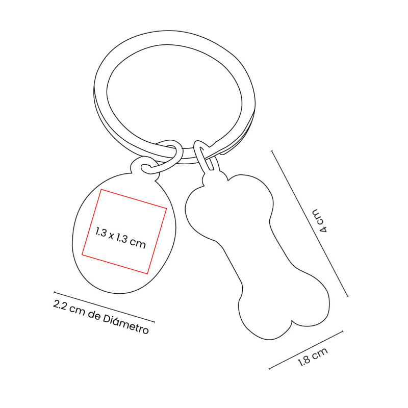 Llavero metálico con diseño en forma de hueso y placa redonda para grabado. Personalízalo con el nombre de tu mascota, una fecha especial o cualquier texto que desees. Además de mantener tus llaves organizadas, también te permite recordar a tus mascotas.