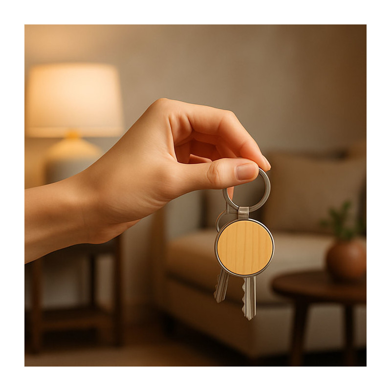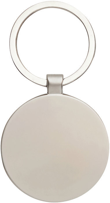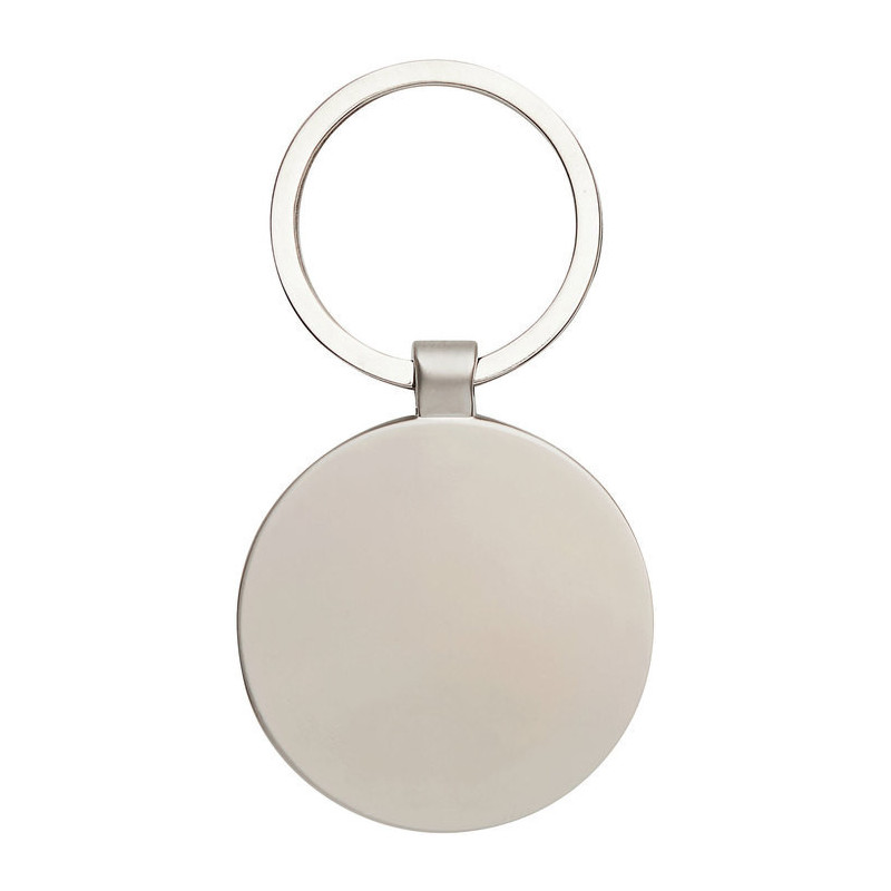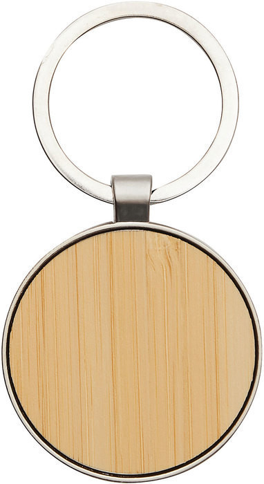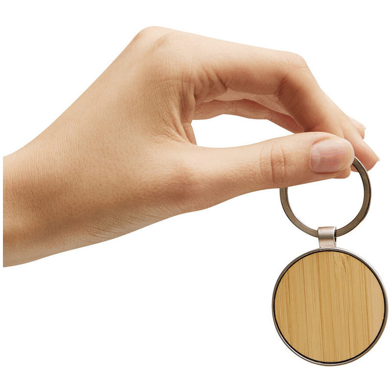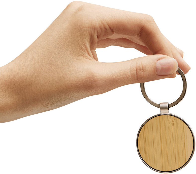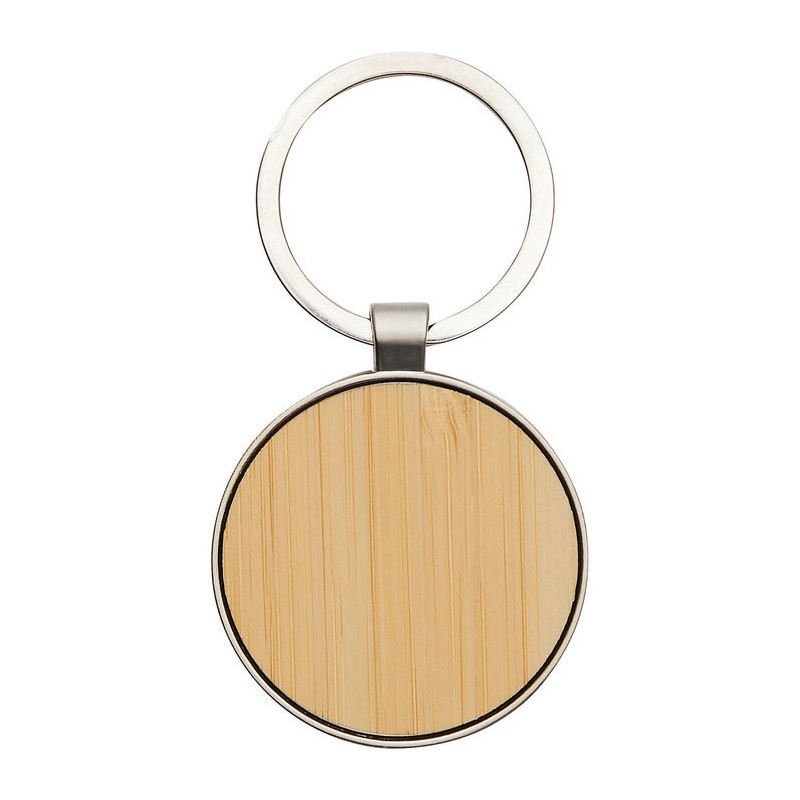 Llavero con forma circular. Estructura metálica con aleación de zinc con acabado brillante y panel frontal de bambú barnizado.