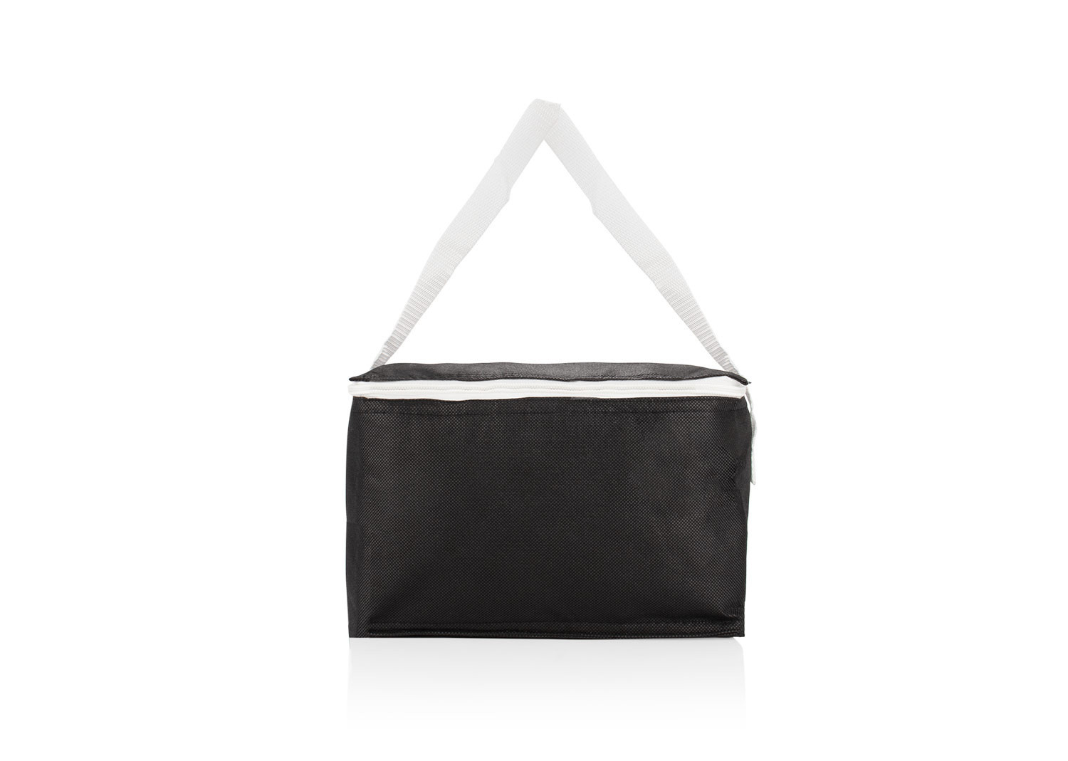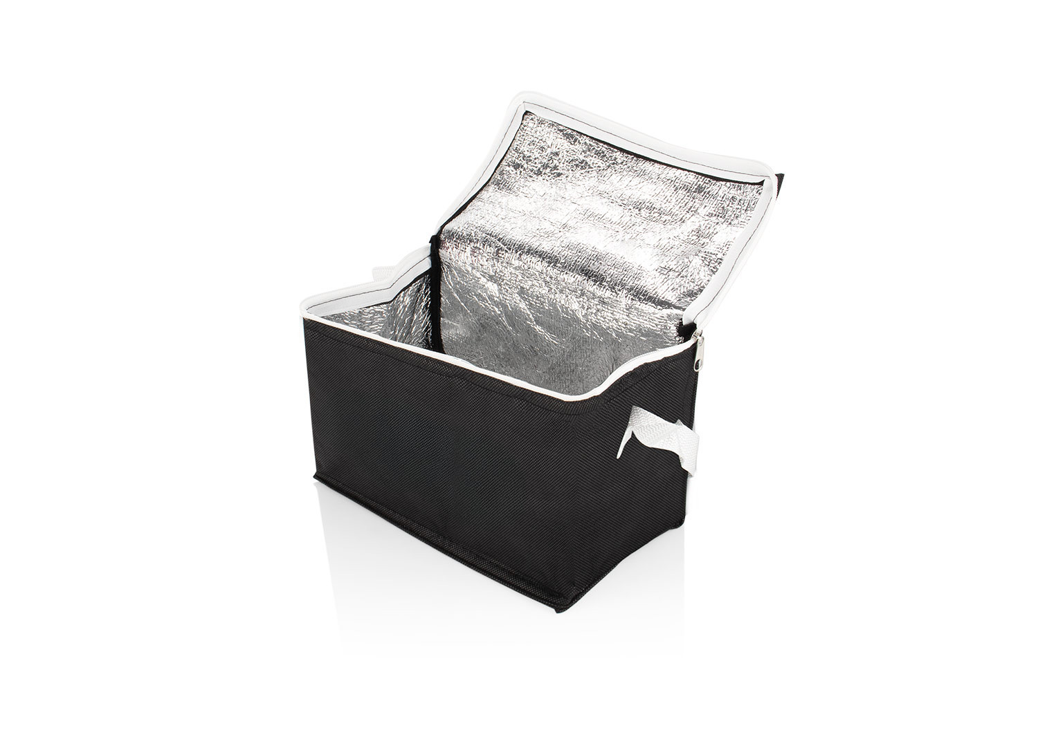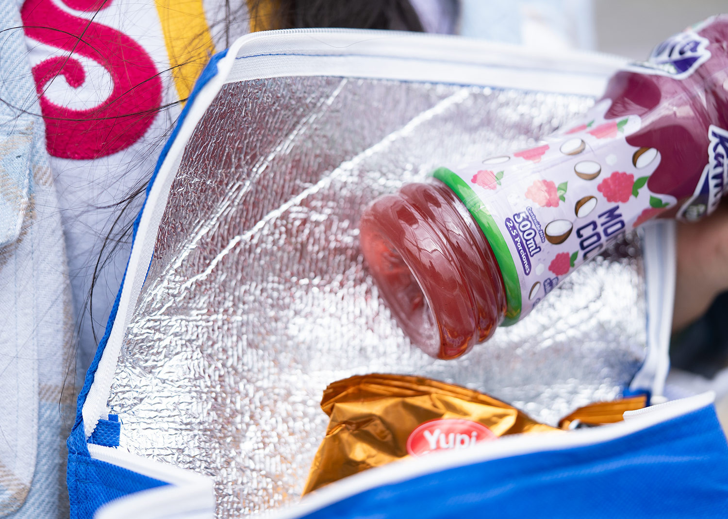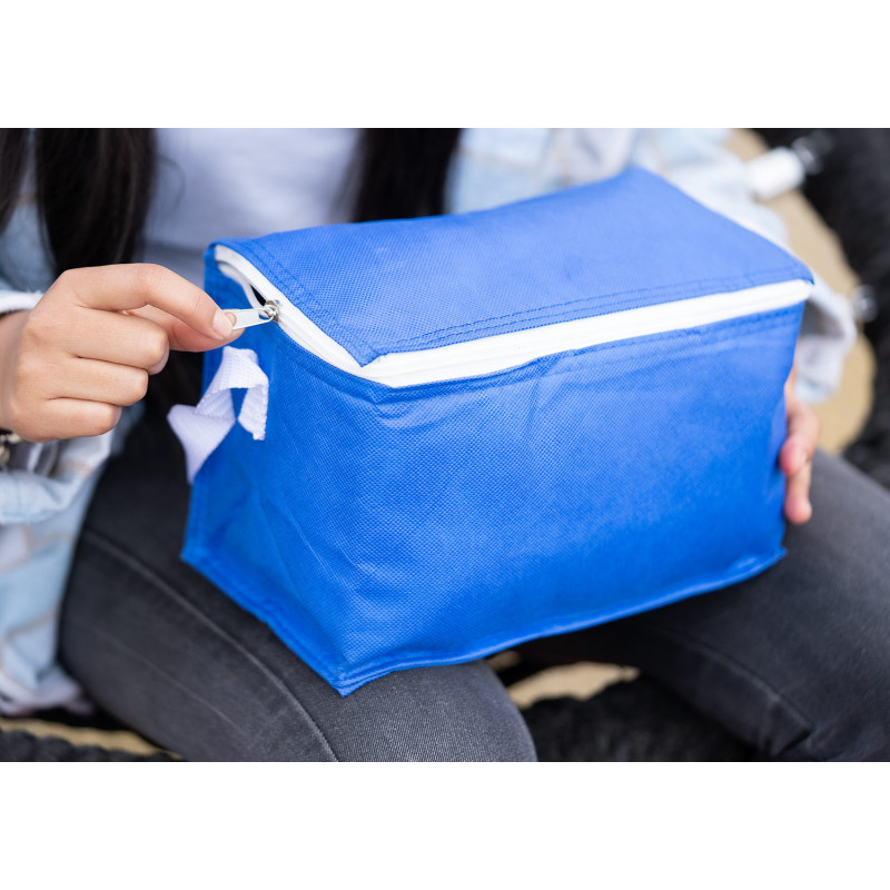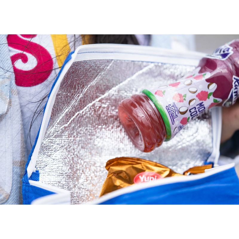 Lonchera de tela cosida, con recubrimiento interior para conservar la temperatura. Cierre de cremallera y manija en tela.