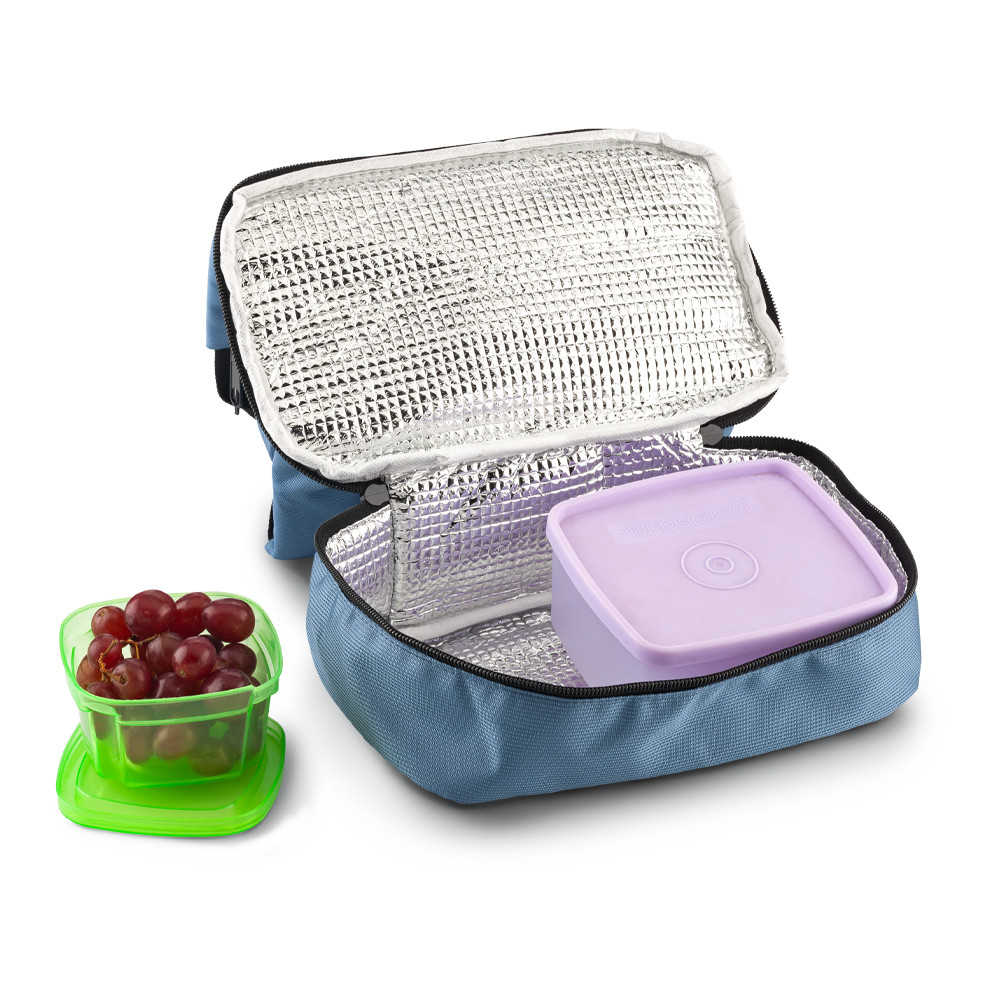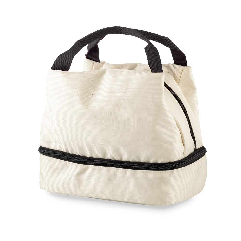 Nevera en poliéster, con interior en aluminio. Dos compartimientos con cremallera.