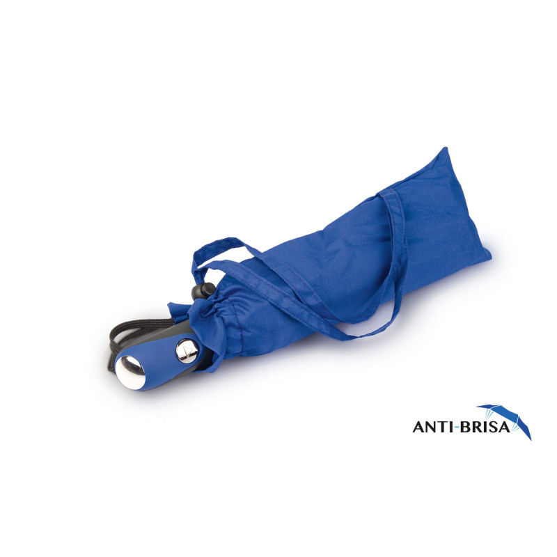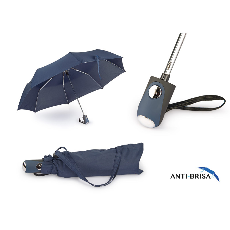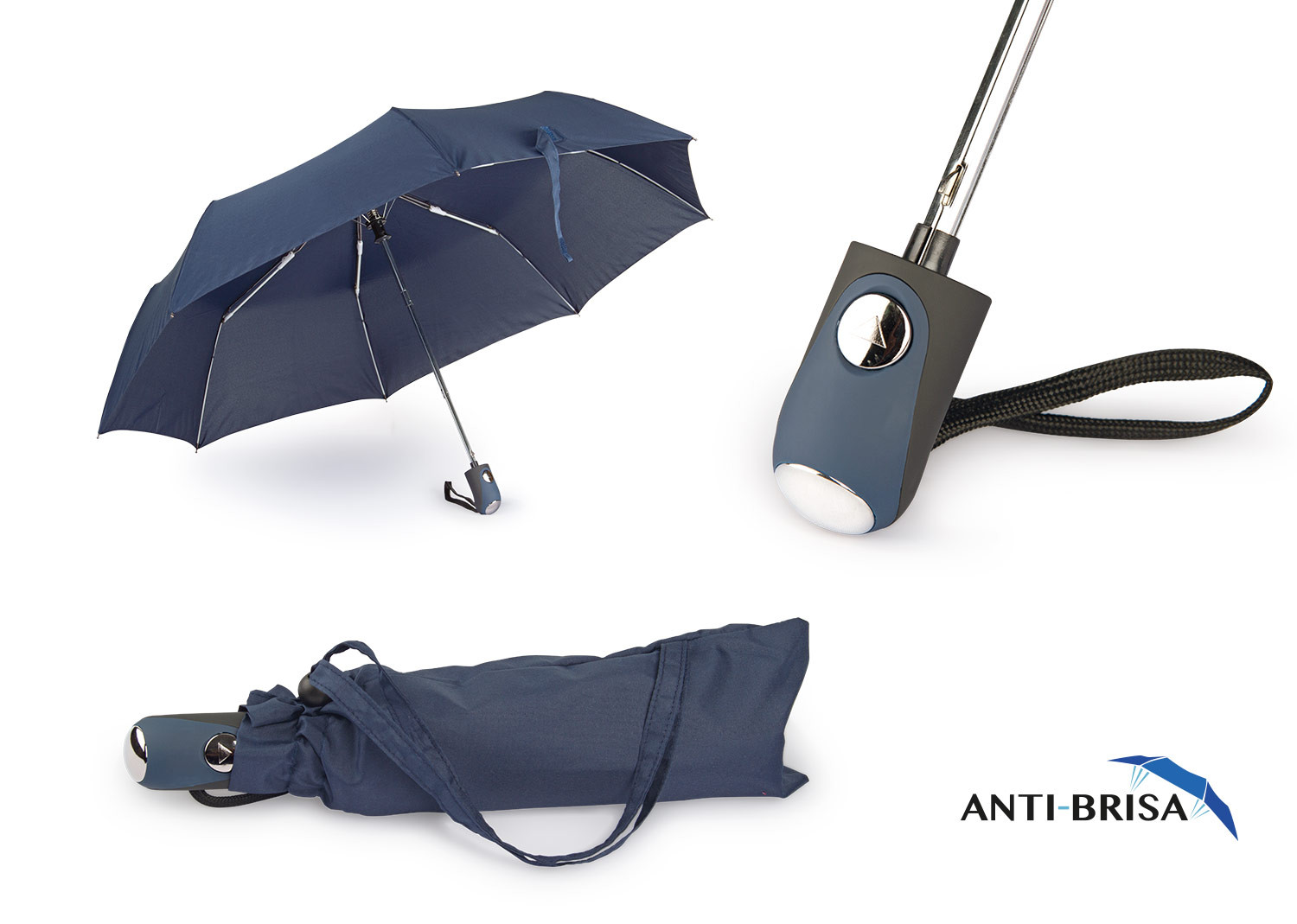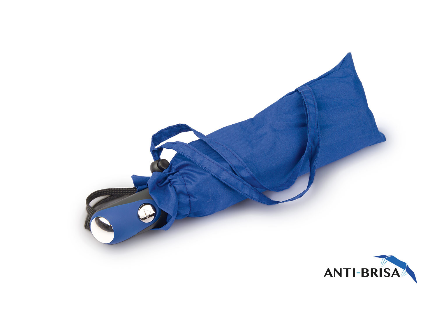 Paraguas 3 secciones de apertura automática y cierre manual. Antibrisa. Funda en la misma tela del paraguas con cordón ajustable.