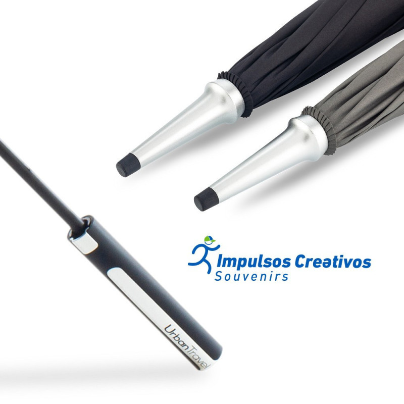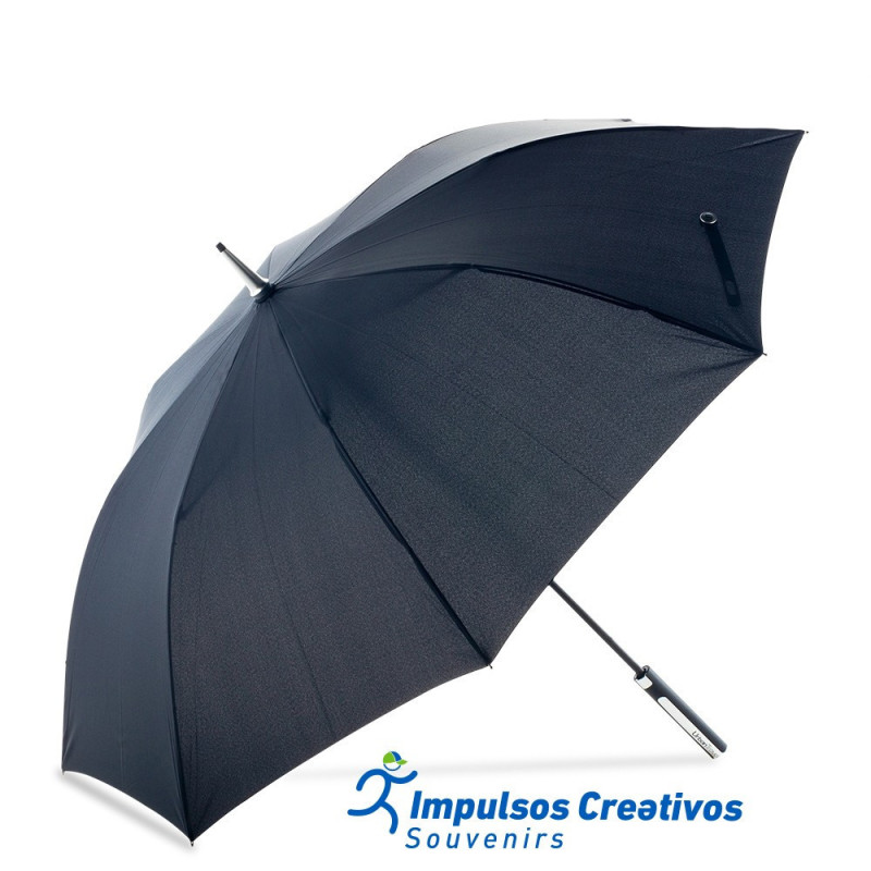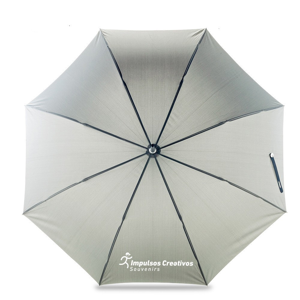 Poliéster pongee 190T. Apertura automática, cierre manual. Marco en fibra de vidrio, mango plástico y punta metálica. Con forro para cargar. 8 cascos