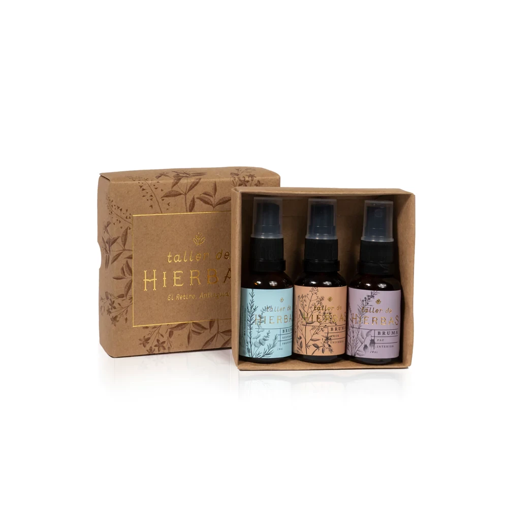 Kit Mini Brumas Elige tus 3 favoritas: Bruma Paz Interior Desodorante Natural Bruma Amor Universal Bruma Espiritu Alegre Bruma Manto de Hierbas Bruma Respiración Profunda Aceite De Almendras Dulces