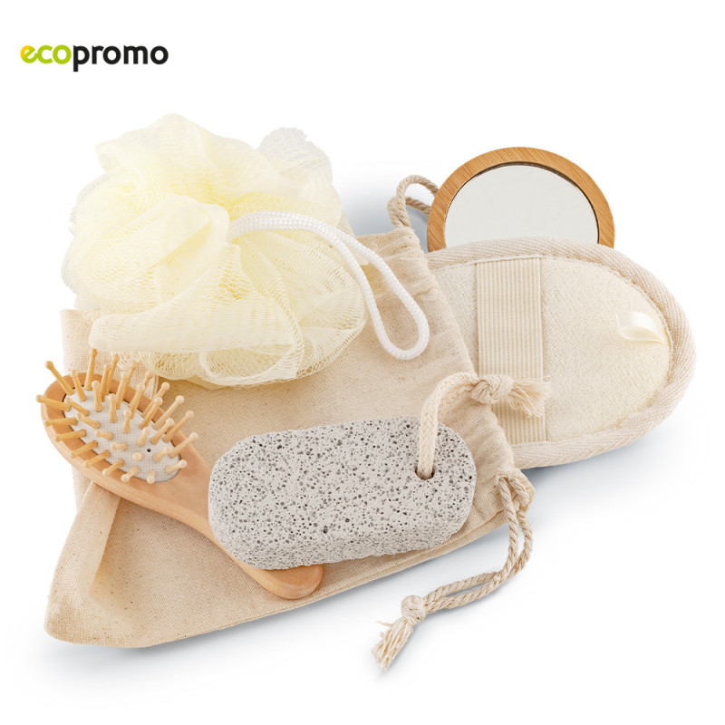 Set de Baño VanitySet de baño y cuidado personal en bolsa de algodón que incluye: cepillo para el cabello, esponja suave, esponja exfoliante, piedra pómez, y espejo de bambú. Artículo para uso personal, no se admiten cambios/devoluciones.