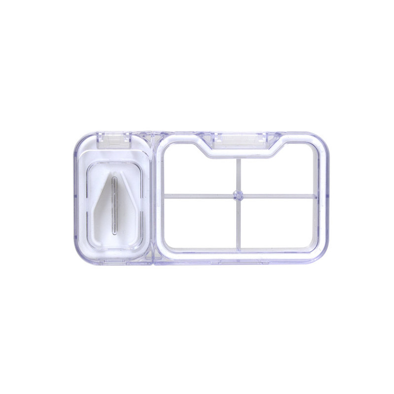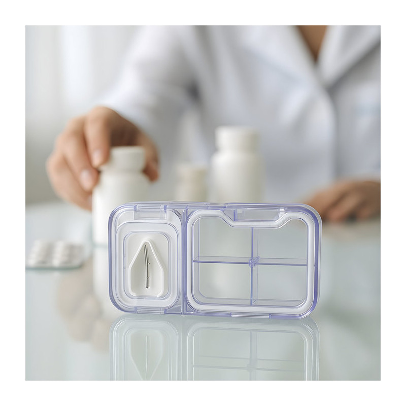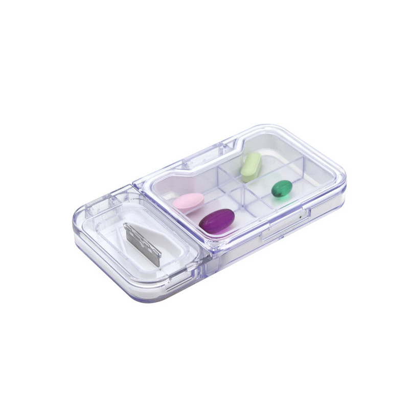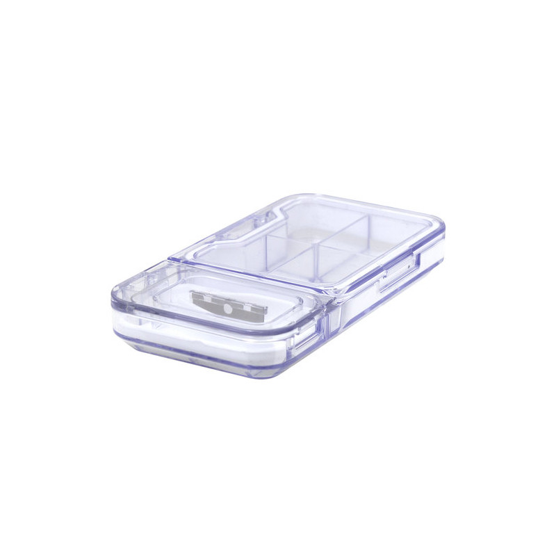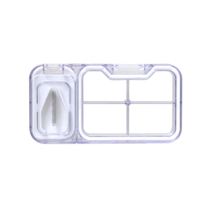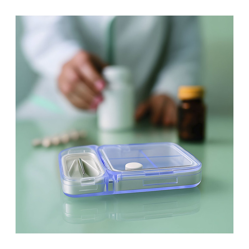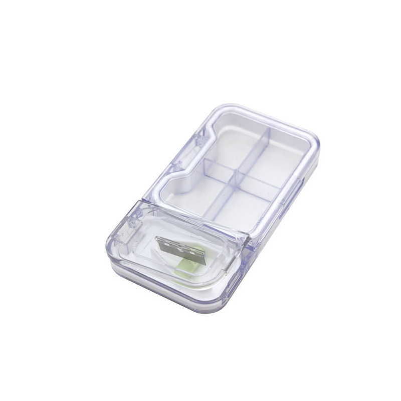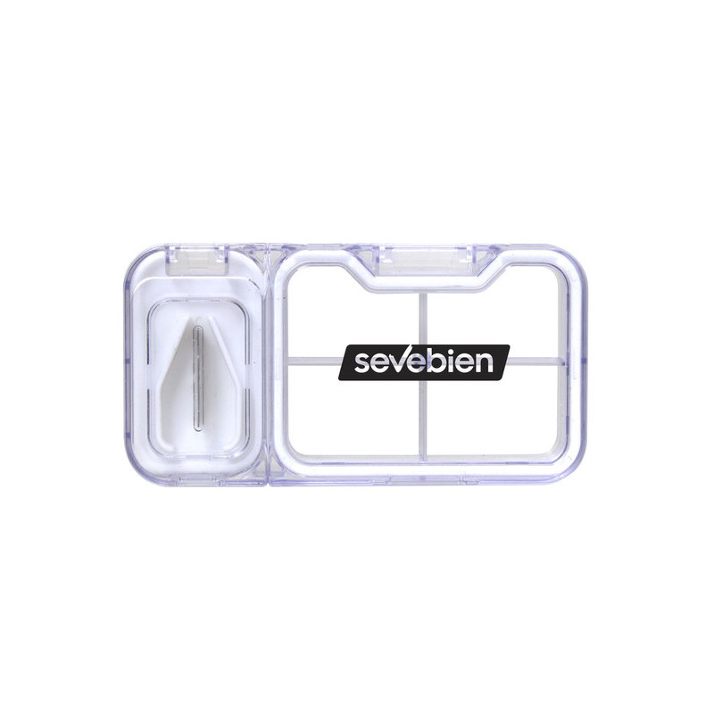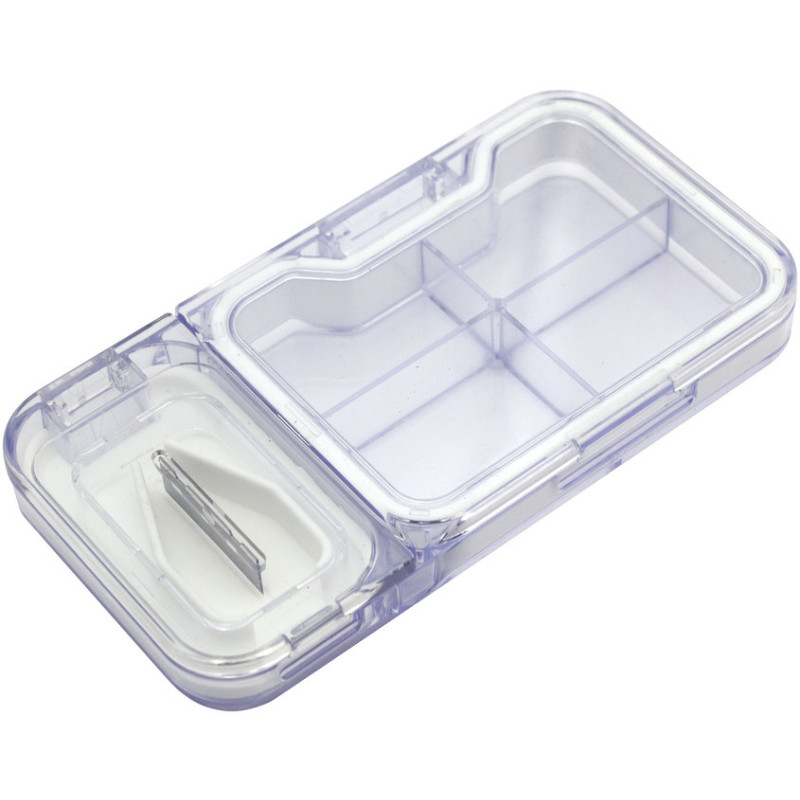Pastillero organizador corta pastilla. Compartimento principal con cuatro divisiones y recubrimiento perimetral de silicona. Compartimento secundario con base de silicona y soporte regulable de pastillas. Cuchilla de acero incorporada en la tapa. Ambos compartimentos con tapa rebatible y cierre a presión.