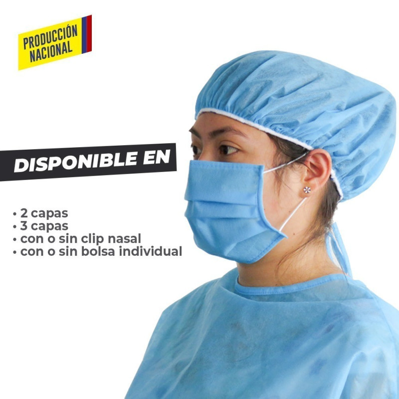 Tapabocas Desechable 3 Pliegues Adulto - Prod Nal Tapabocas desechable de producción nacional, 3 pliegues con elástico y clip nasal. Cosido. Fabricado 100% polipropileno virgen 40 gramos (tela tipo SS). No estéril. Talla única. Empaque bolsa Individual. Se factura en múltiplos de 50 unidades. Disponible en: 2 capas 3 capas con o sin clip nasal con o sin bolsa individual Artículo para uso personal, no se admiten cambios/devoluciones