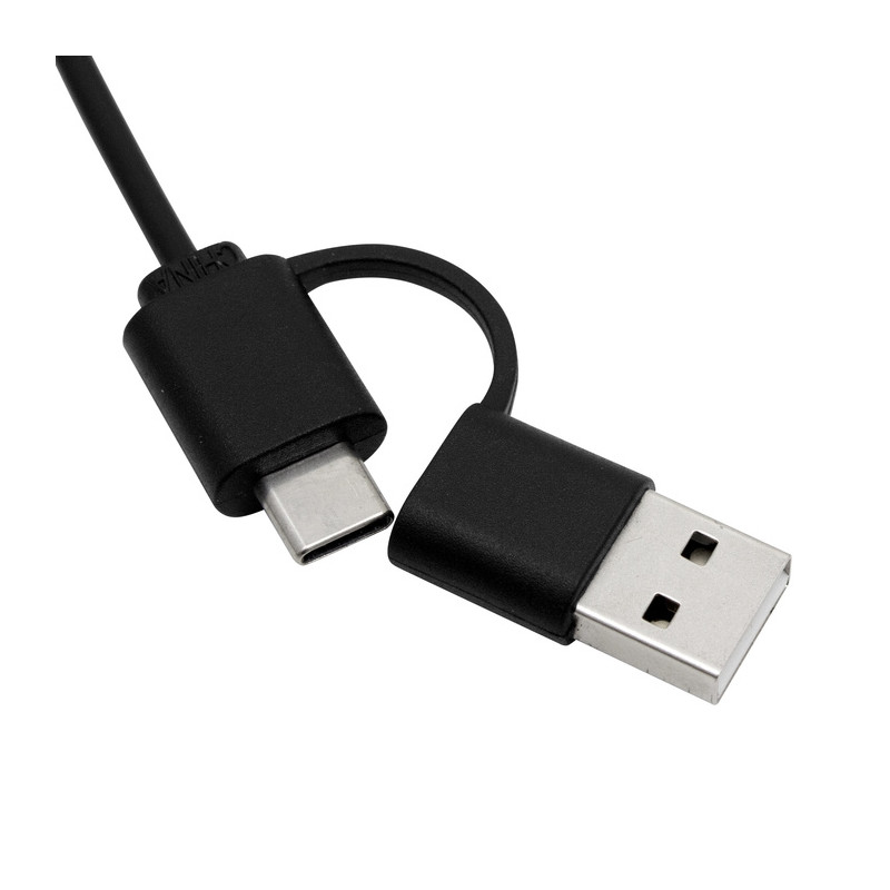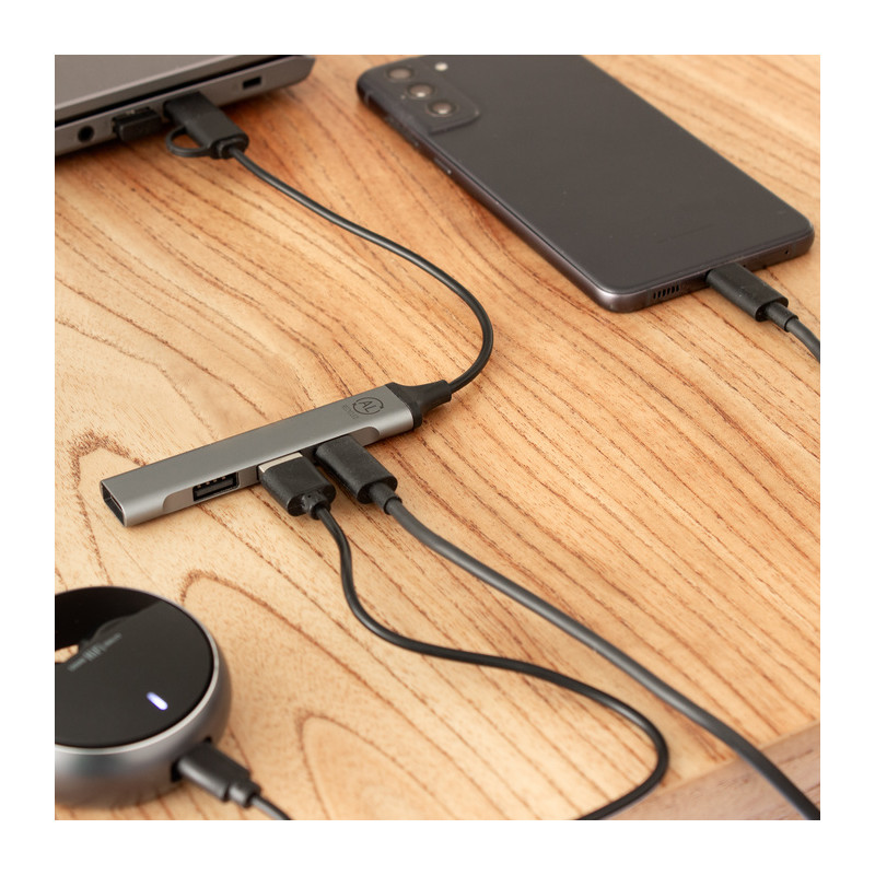 Multiplica tus conexiones y optimiza tu espacio. Adaptador HUB multipuerto. Entrada: 3 USB + 1 USB tipo C. Salida: 2 en 1 (USB y USB tipo C). Cable negro de conexión.