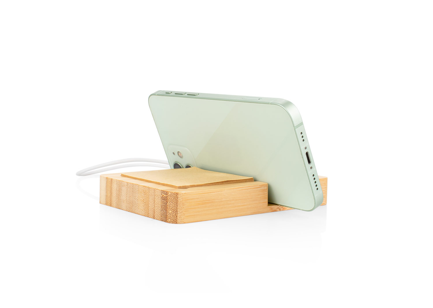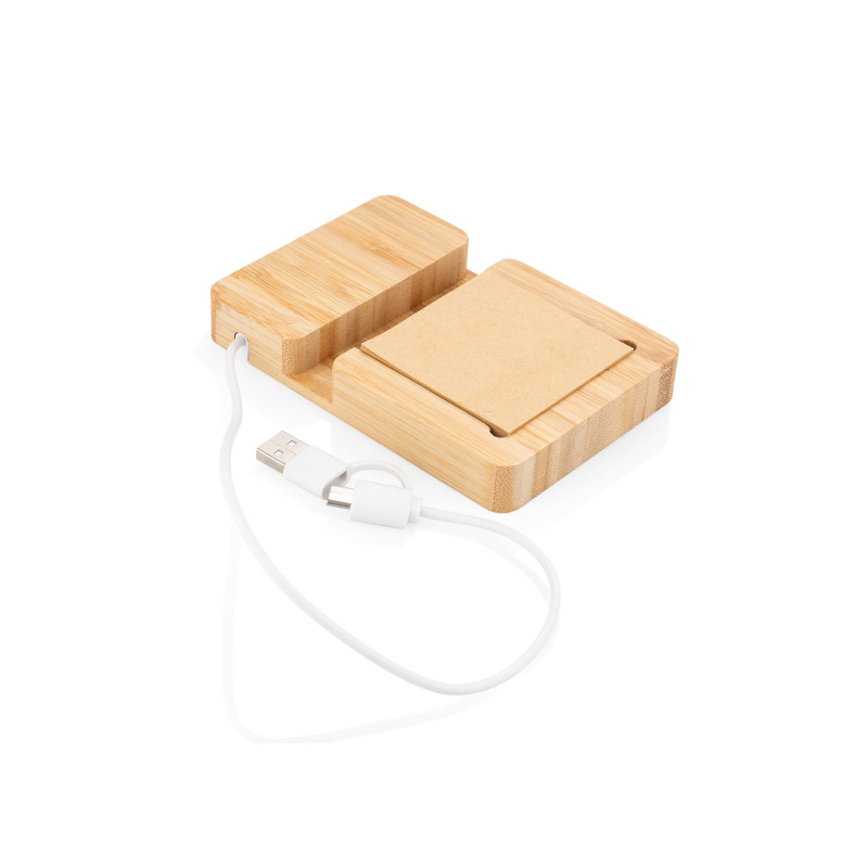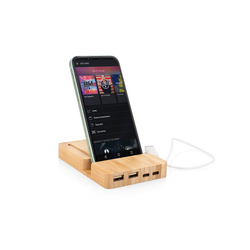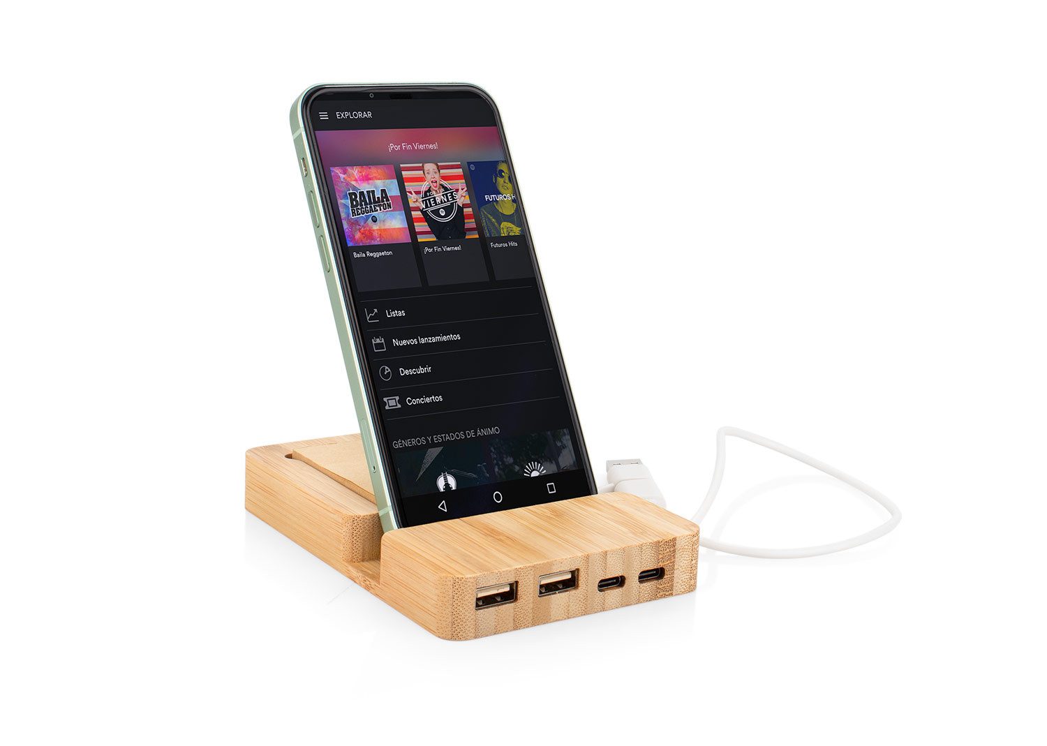 Multipuerto de bambú con soporte para teléfono y notas adhesivas. 2 entradas Tipo C, 2 entradas USB. 1 salida tipo C o USB.