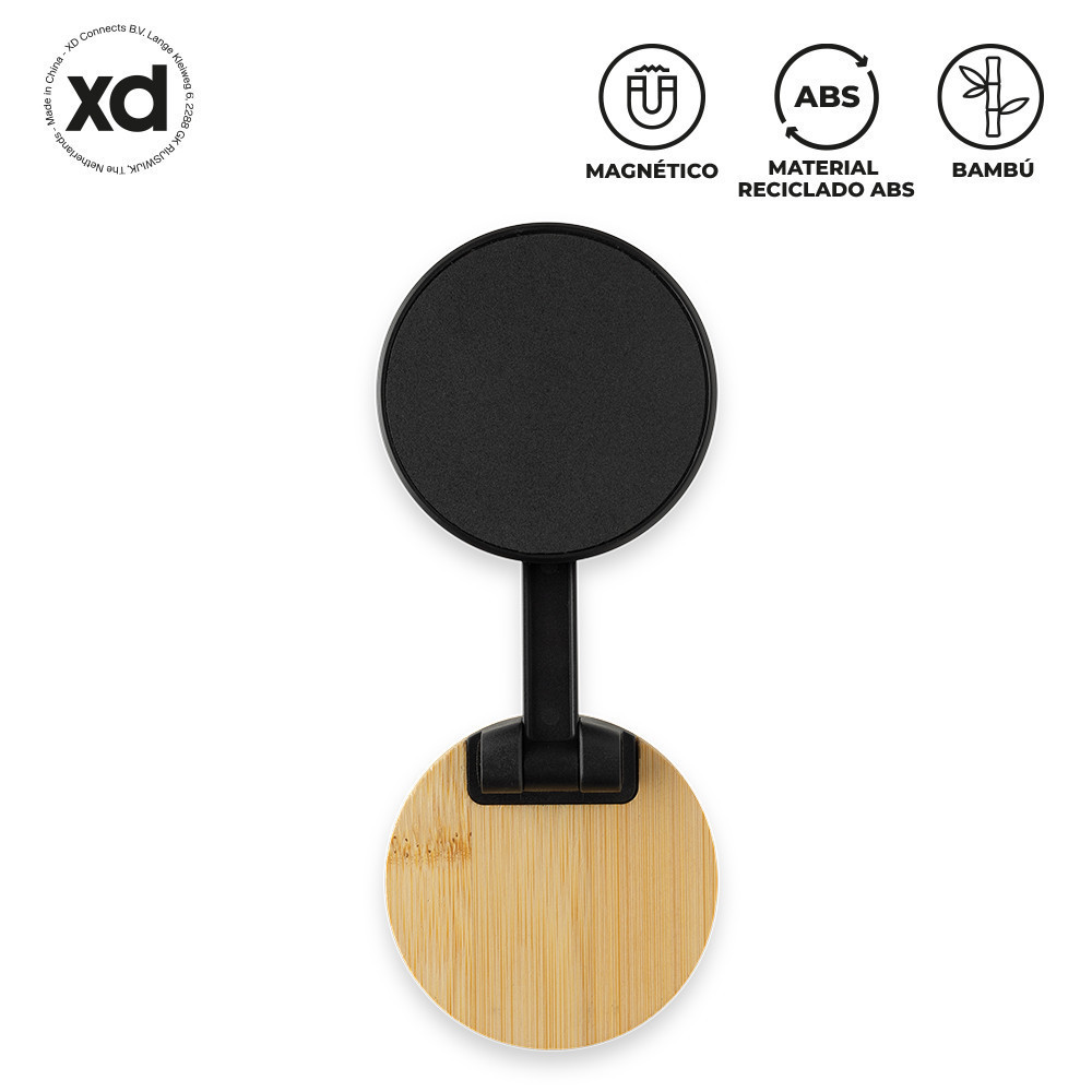 Soporte para celular en plástico reciclado y bambú. Con imán. Compatible con teléfonos con imán integrado (iPhone 12 en adelante). Compatible con Android con teléfonos que admiten QI2.