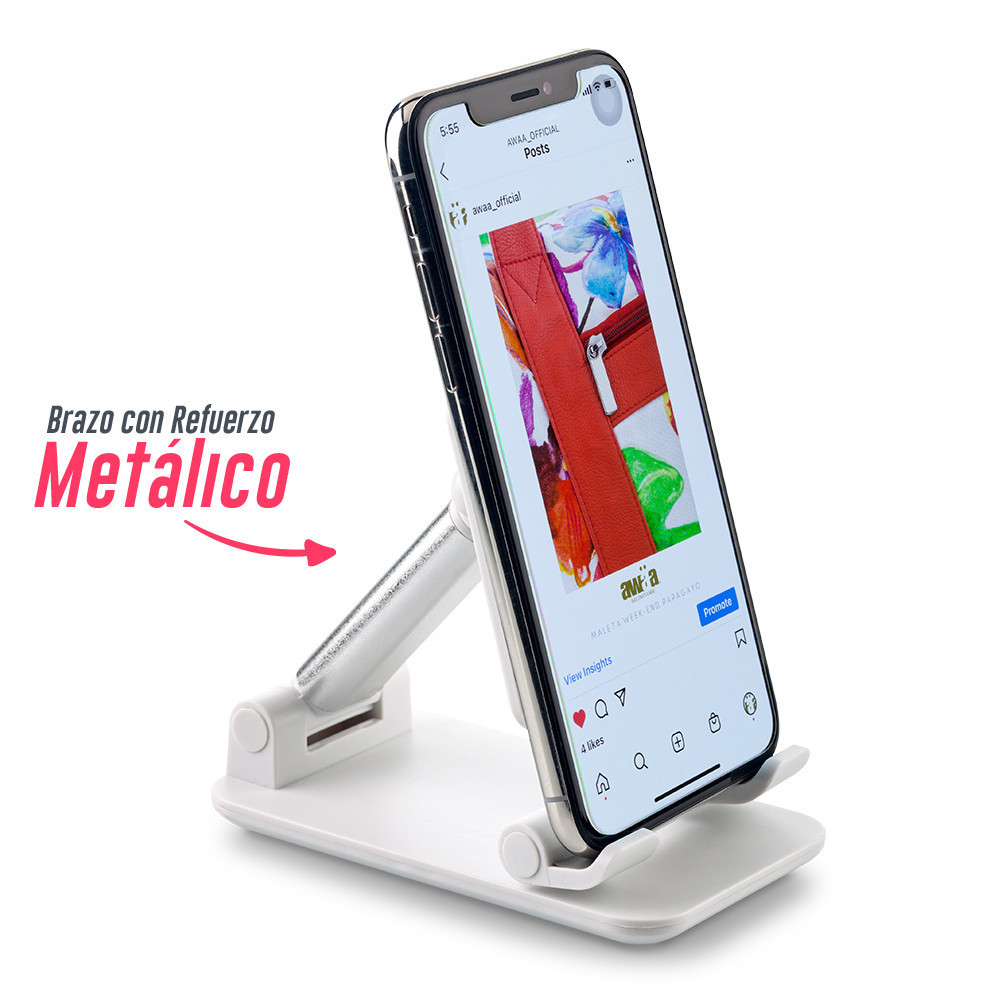 Soporte plástico plegable y escualizable con refuerzo metálico, accesorio y puntas antideslizantes. Empaque caja individual.