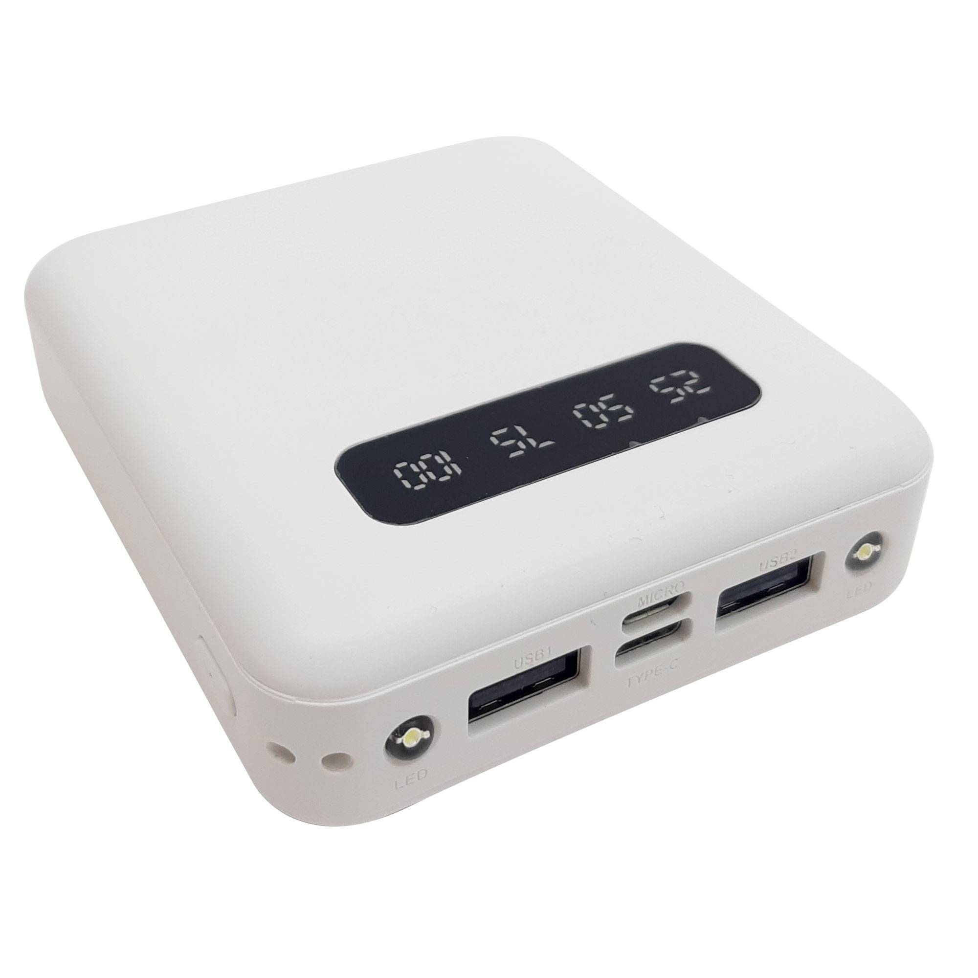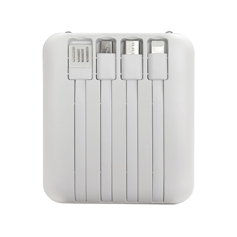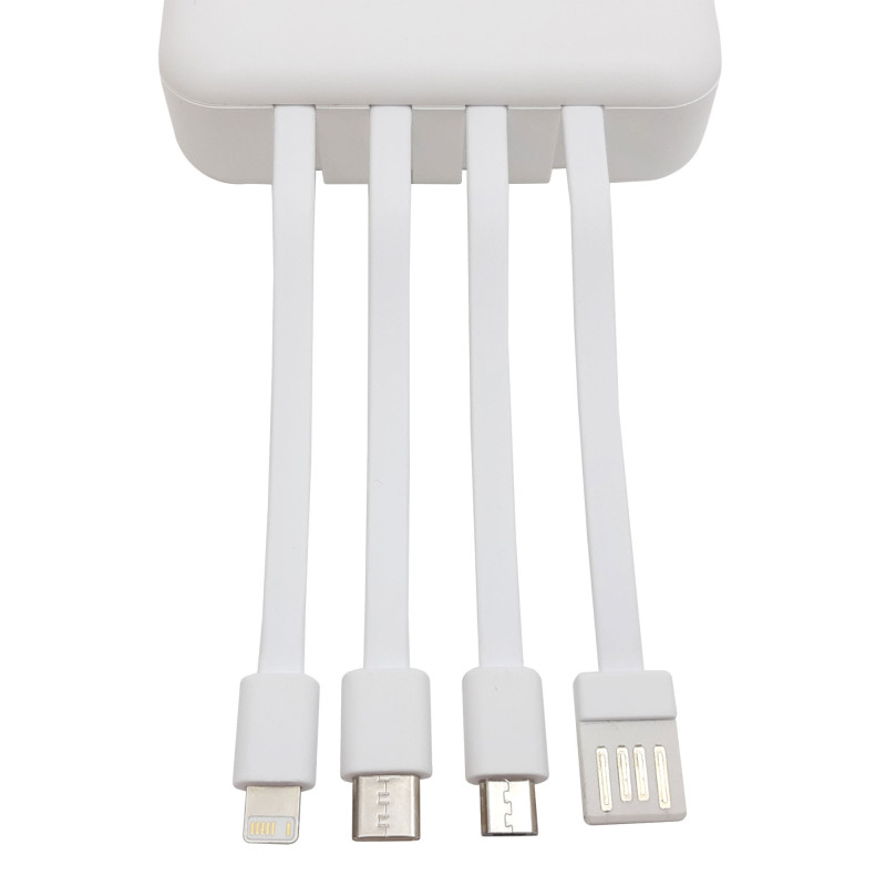 Plástico ABS acabado mate. Powerbank multipuerto. Pantalla digital. Doble salida USB. Entradas micro-USB y USB tipo C. Salida de carga rápida 2A. Linterna dual led. 4 cables de carga integrados: USB, Micro USB, Tipo C y IPhone. Capacidad: 5000 mAh. Puede cargar hasta 5 dispositivos al tiempo. Presentación en caja de regalo.