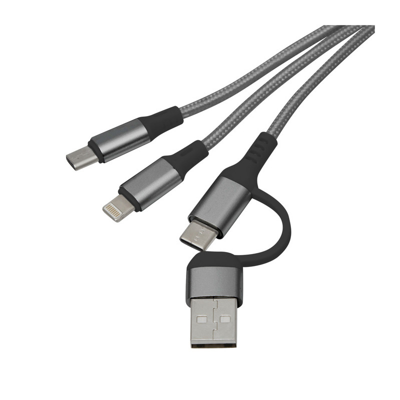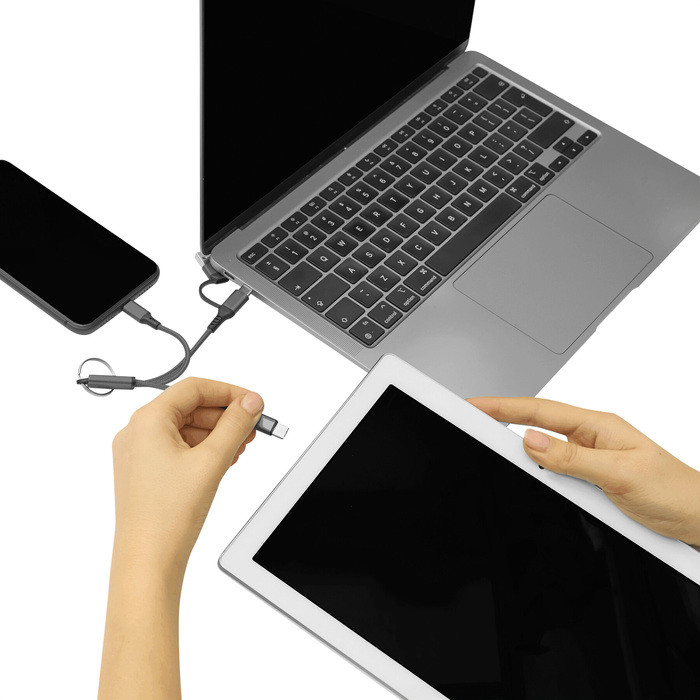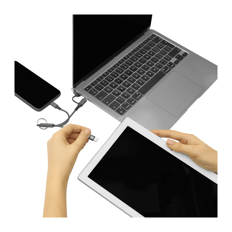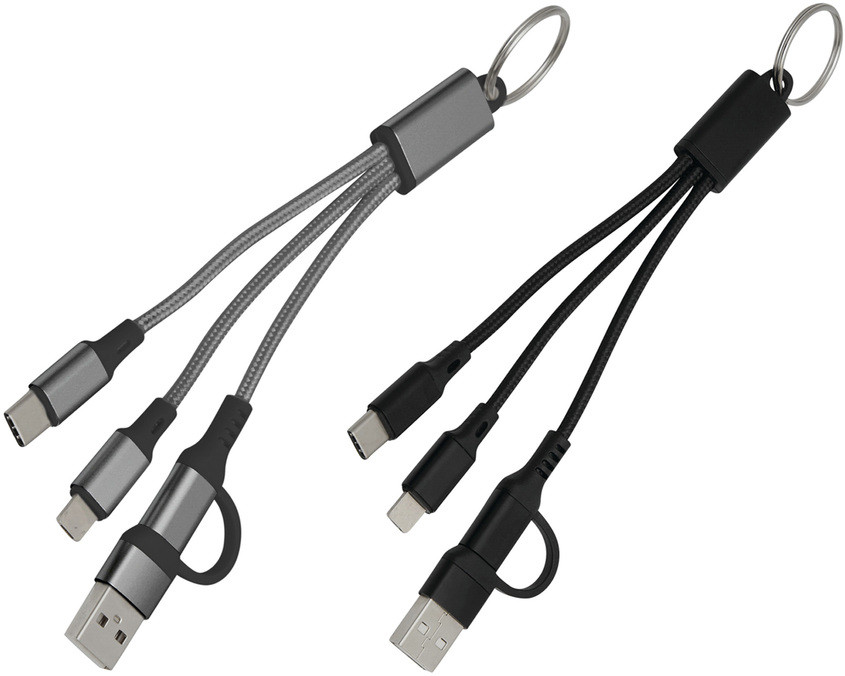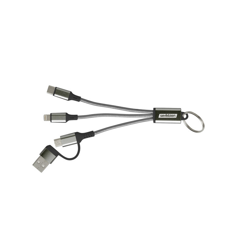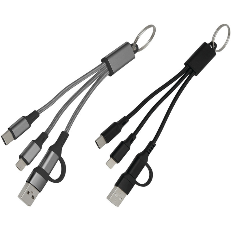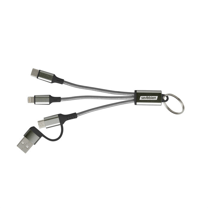 Todo lo que necesitas al alcance de tu mano Cable de carga con llavero. Entrada: 2 en 1 (USB + USB tipo C). Salida: USB tipo C + lightning. Medidas: 15,5 cm. Materiales: Aleación de aluminio reciclado, PVC y nylon