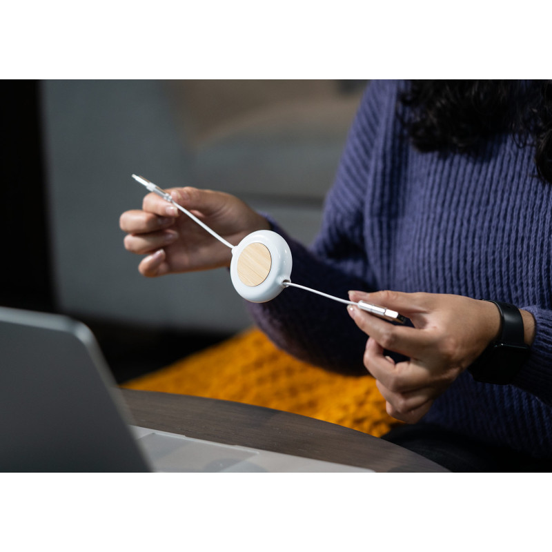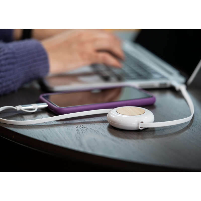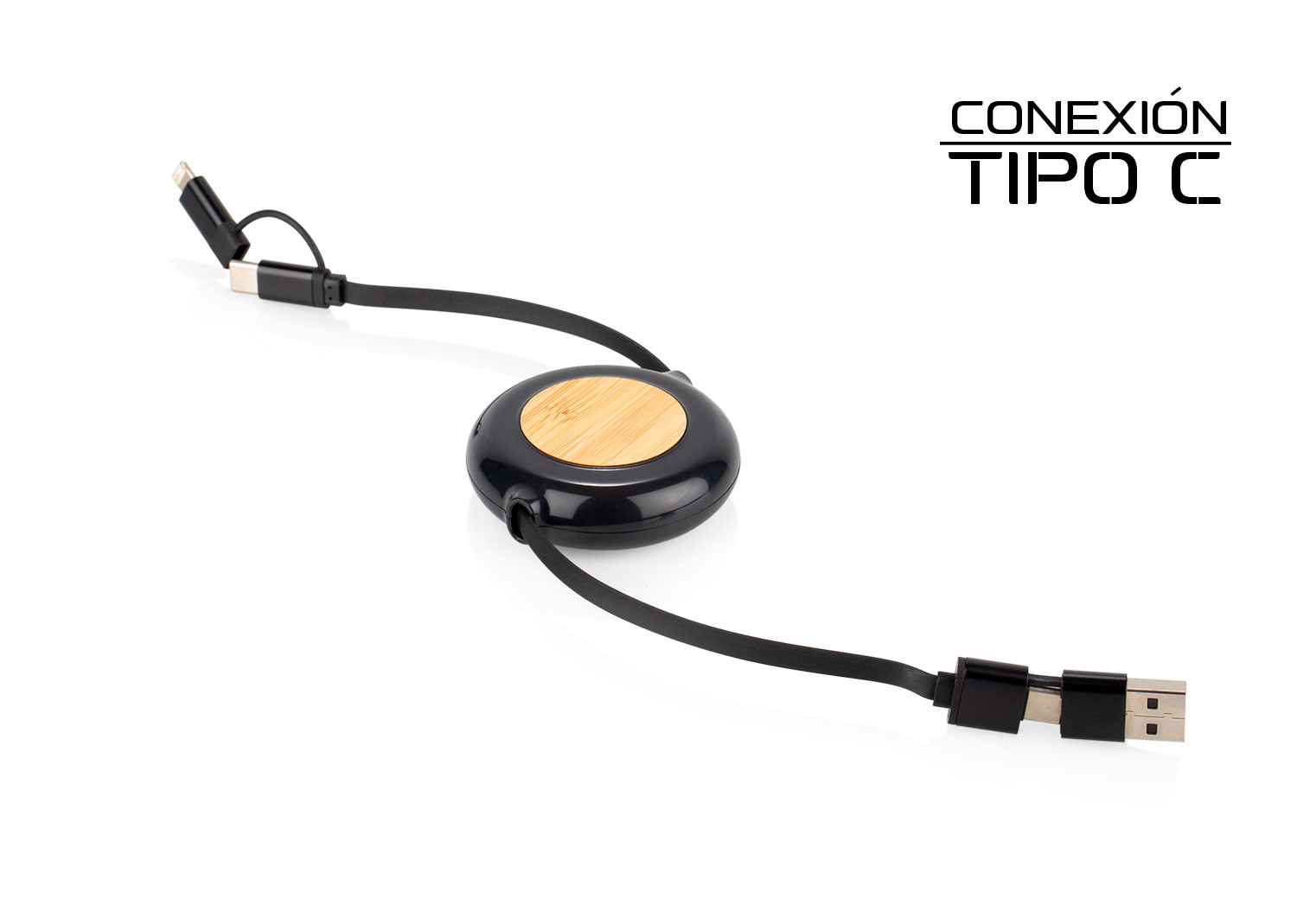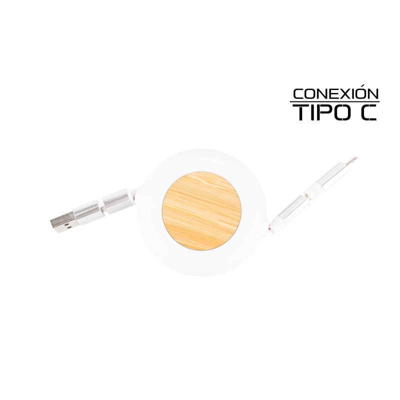 Cable retráctil estilo yoyo de carga rápida 60 W, ideal para cargar dispositivos móviles con eficiencia. Incluye conectores USB, Lightning y Tipo C en cada extremo para máxima compatibilidad. Diseño compacto con detalle central en bambú