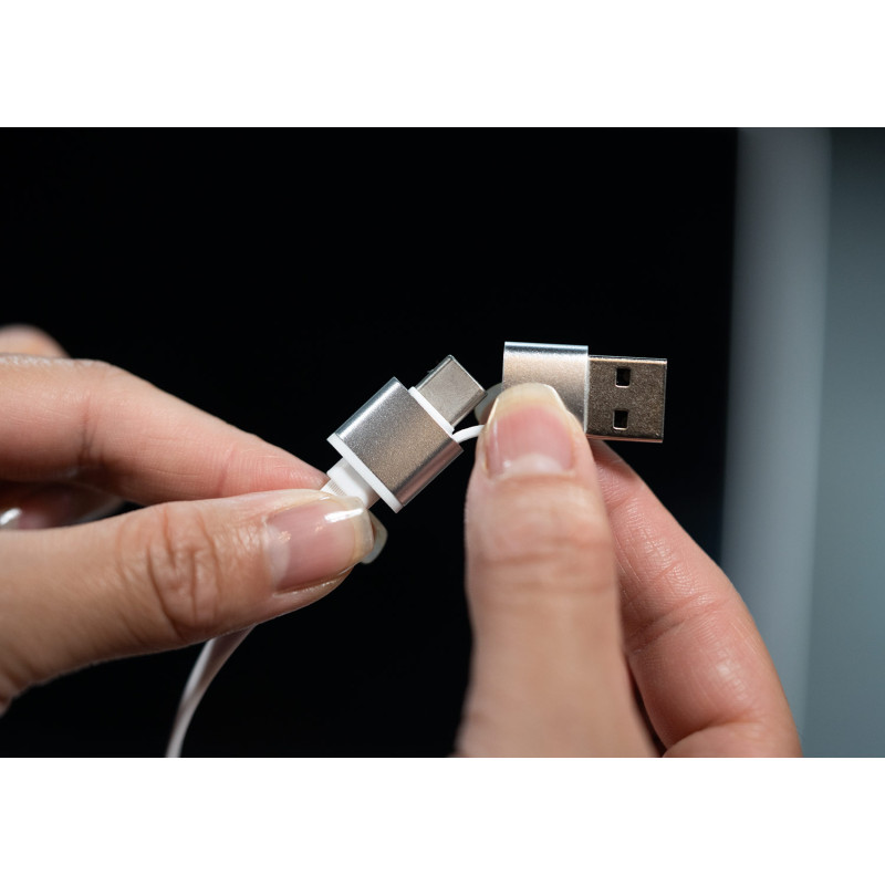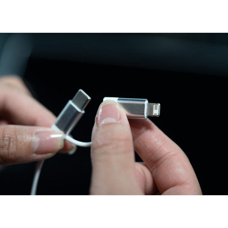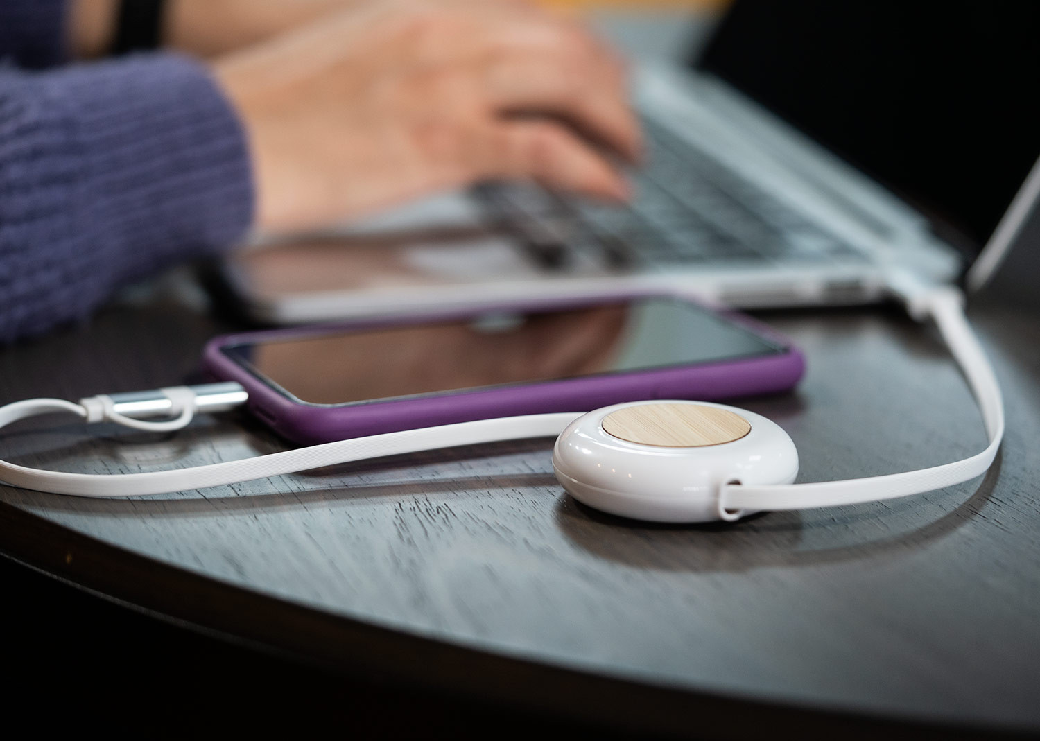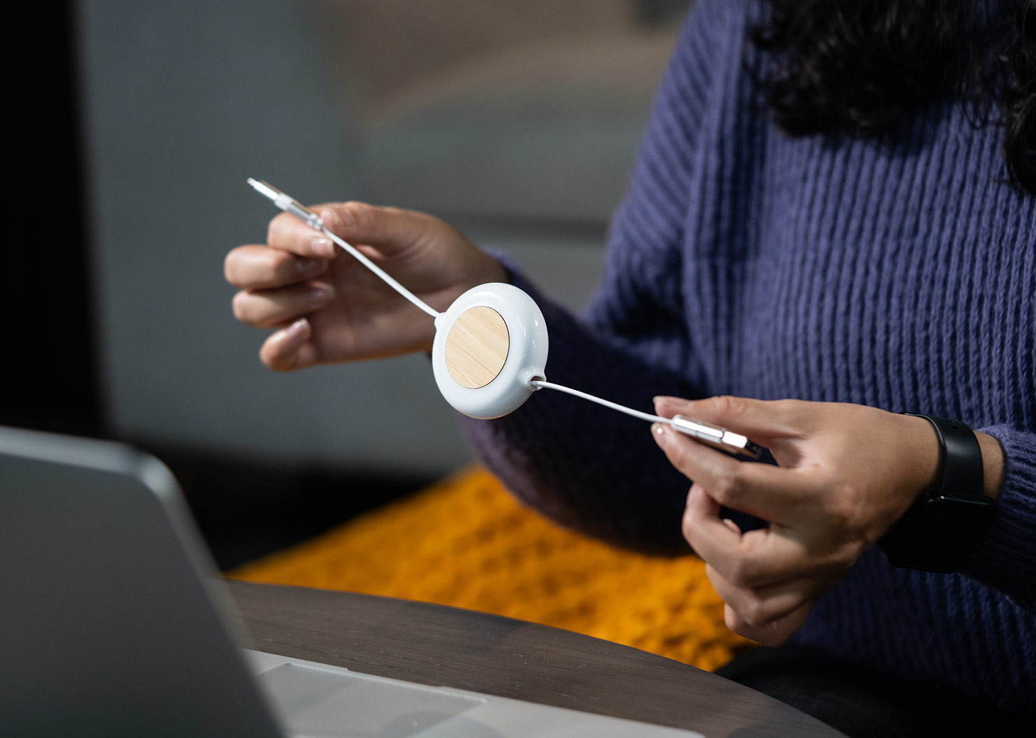 Cable retráctil estilo yoyo de carga rápida 60 W, ideal para cargar dispositivos móviles con eficiencia. Incluye conectores USB, Lightning y Tipo C en cada extremo para máxima compatibilidad. Diseño compacto con detalle central en bambú