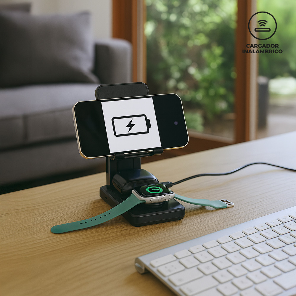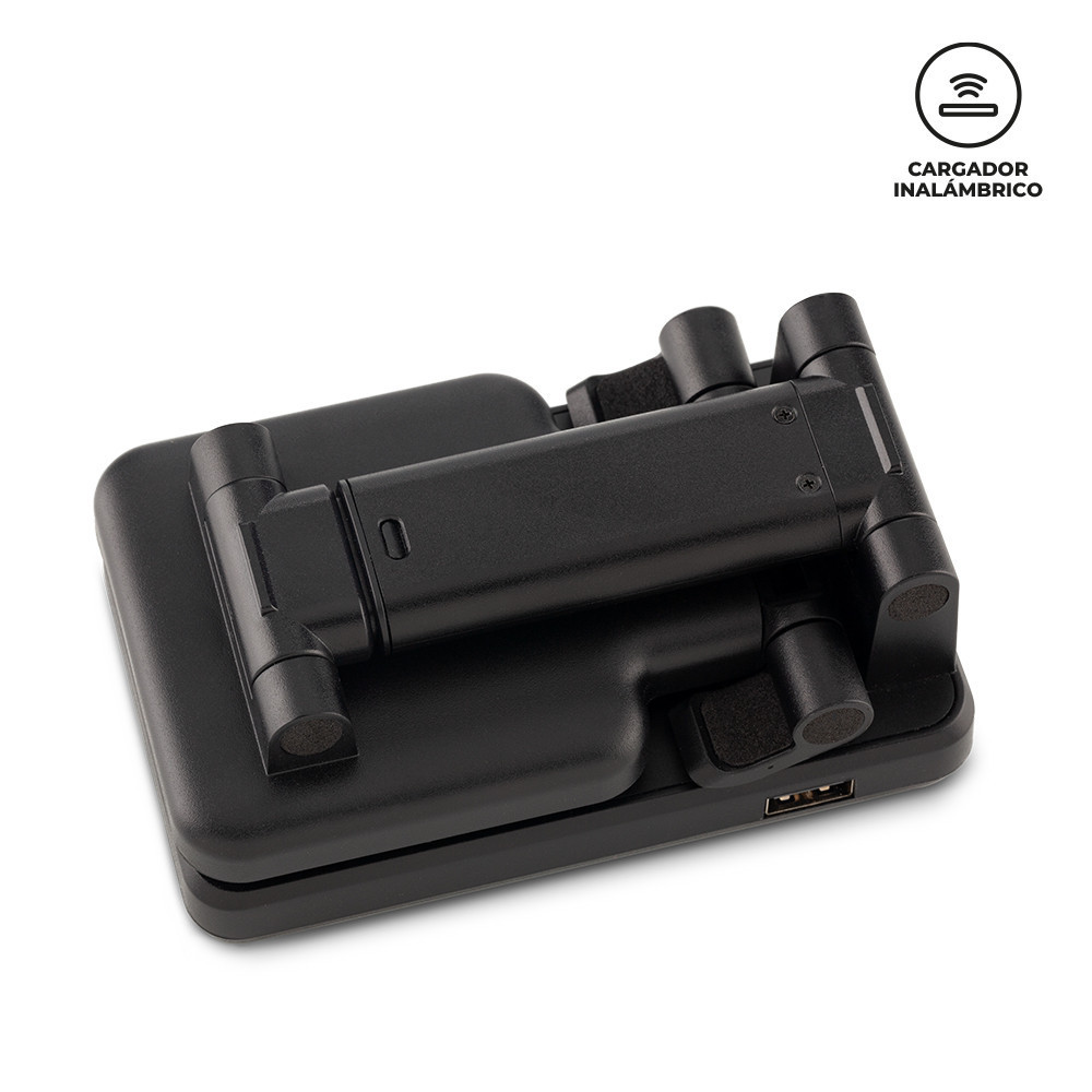Cargador inalámbrico plástico con soporte plegable y ajustable para celular. Carga teléfonos móviles (15W), audífonos (5W) y relojes Samsung / Apple (2W). Incluye cable Tipo C para carga.