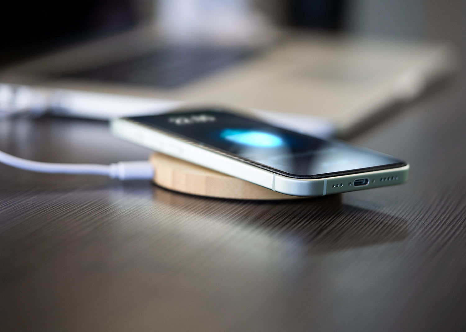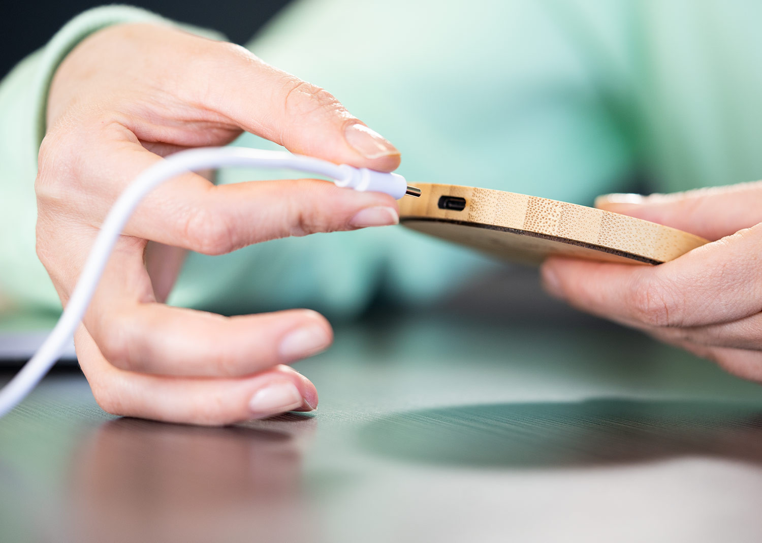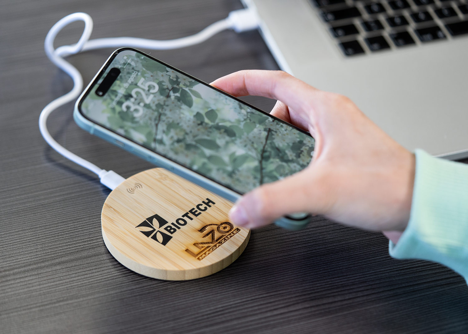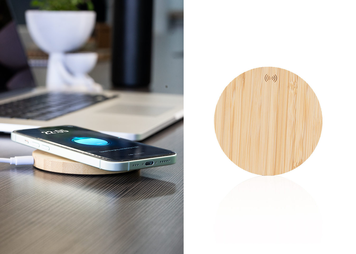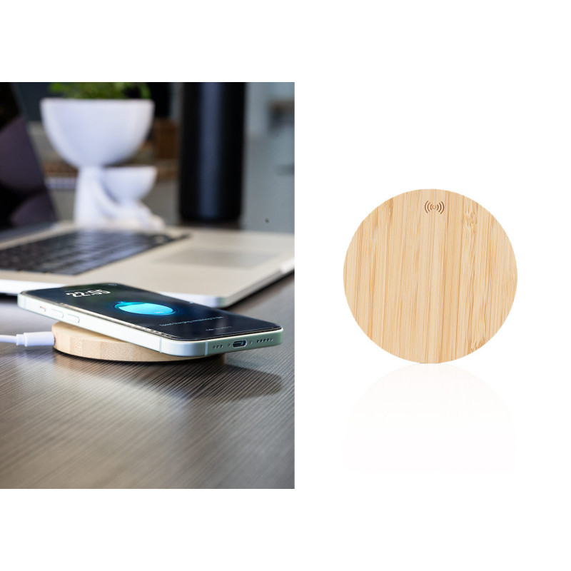 Carcasa en madera y diseño ecológico y natural. Indicador de estado de carga y compatible con dispositivos equipados con tecnología de carga inalámbrica. Amplia superficie de marcaje para dispositivos de diferentes tamaños.