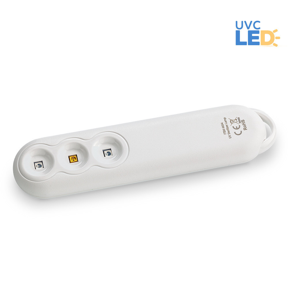 Mini Esterilizador UVC Recargable, Mini esterilizador de luz ultravioleta tipo UVC LED. Plástico ABS, fácil de usar: basta con acercar al objeto durante unos segundos, a una distancia de entre 1 y 2 cm para eliminar microorganismos presentes en las superficies. Potencia 1.5W, longitud de onda de 275 nm, voltaje 3V, con batería recargable integrada (Cable USB incluido). Evitar el contacto con la piel y los ojos. Empaque Caja Individual.