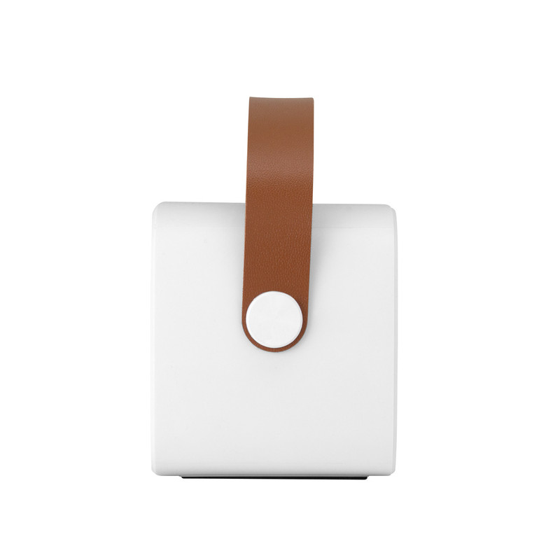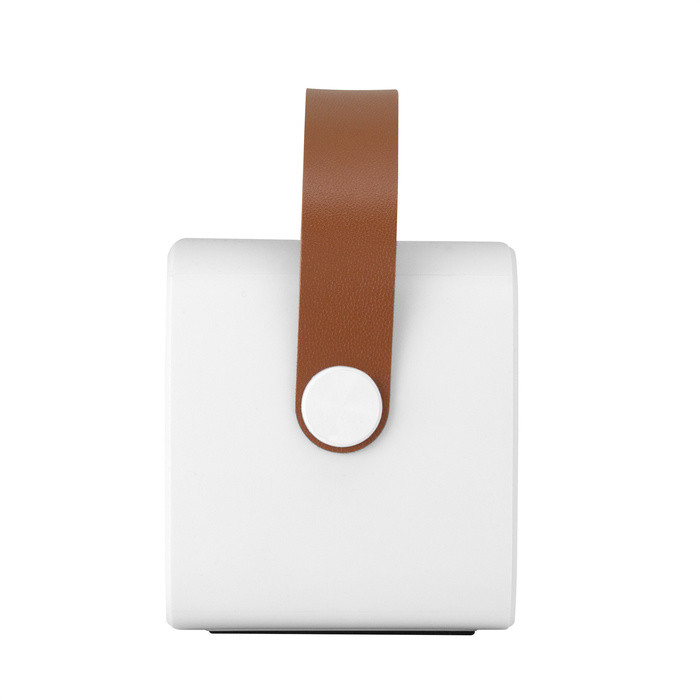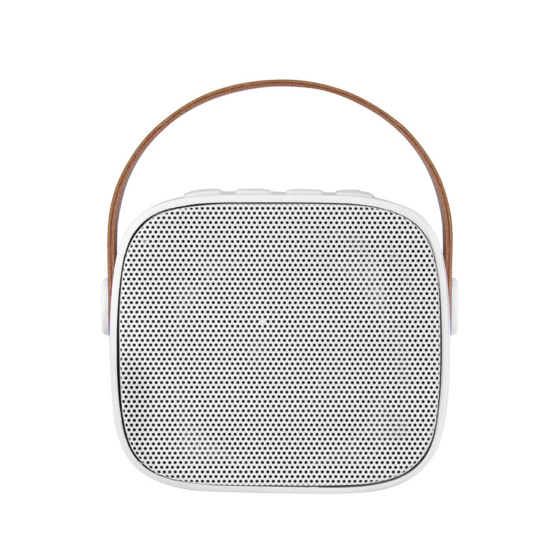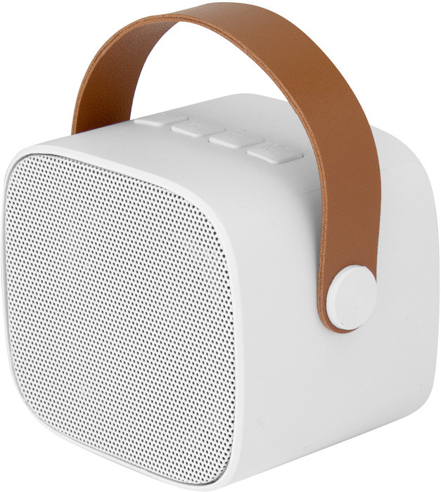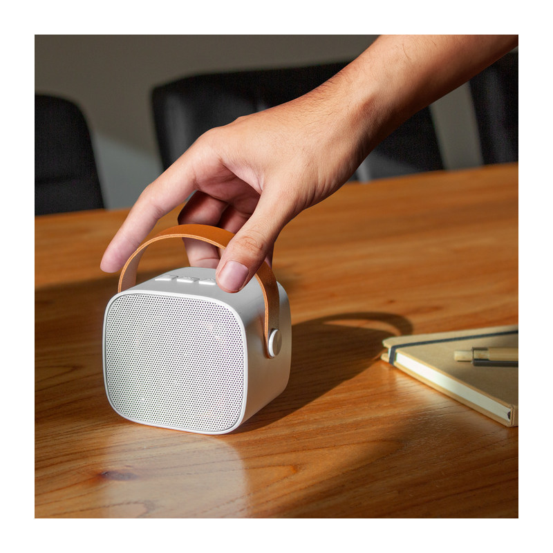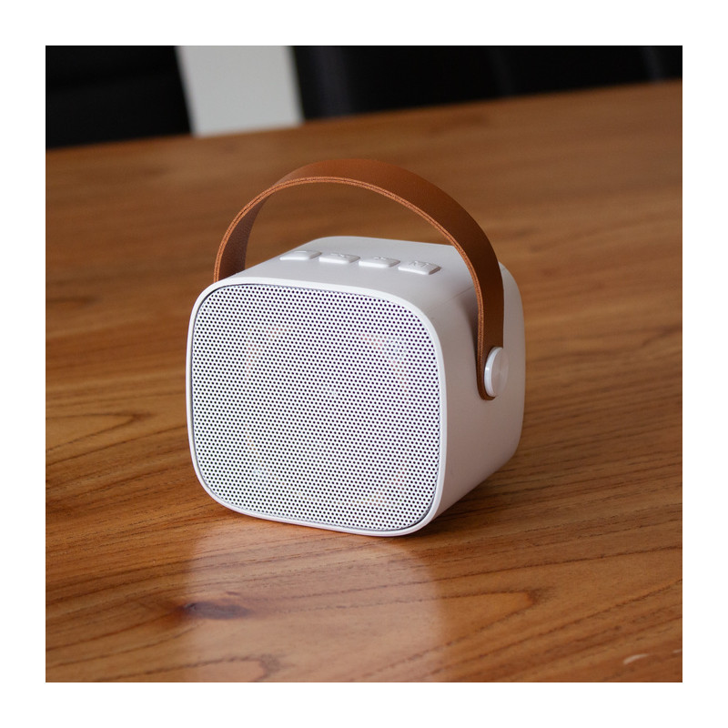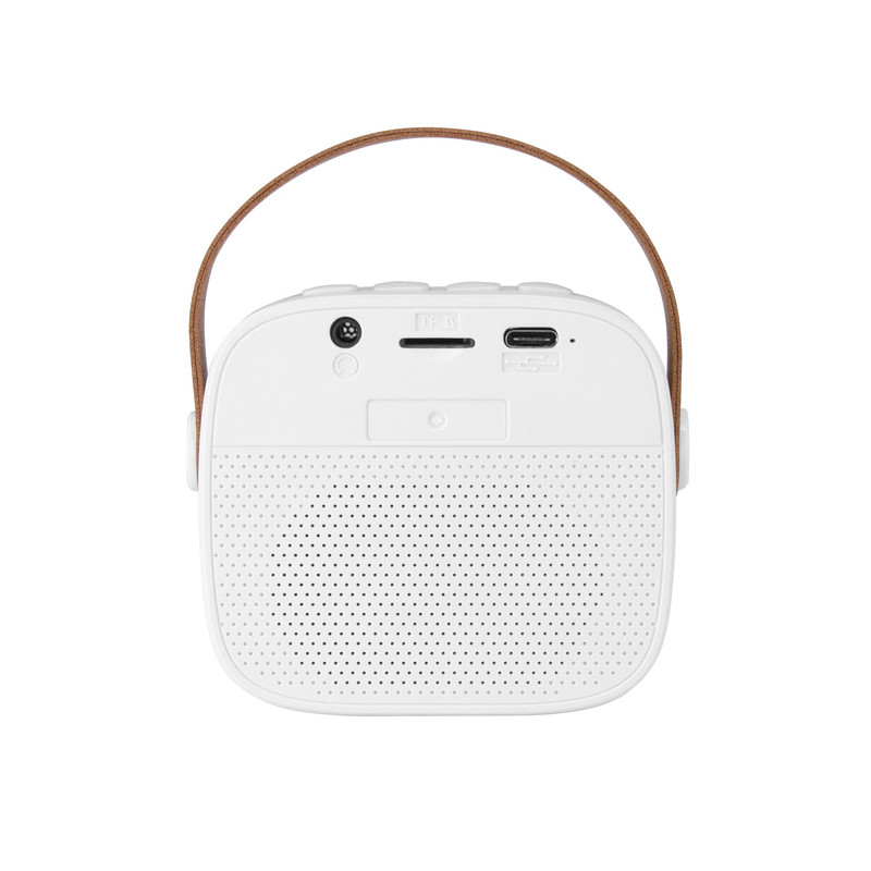 Potencia tu sonido en cualquier lugar Parlante Bluetooth estéreo con Radio FM, tarjeta TF y entrada AUX. Estructura plástica color blanco y asa en poliuretano color marrón. Cable de carga y conexión USB-C en color blanco. Incluye manual de uso.