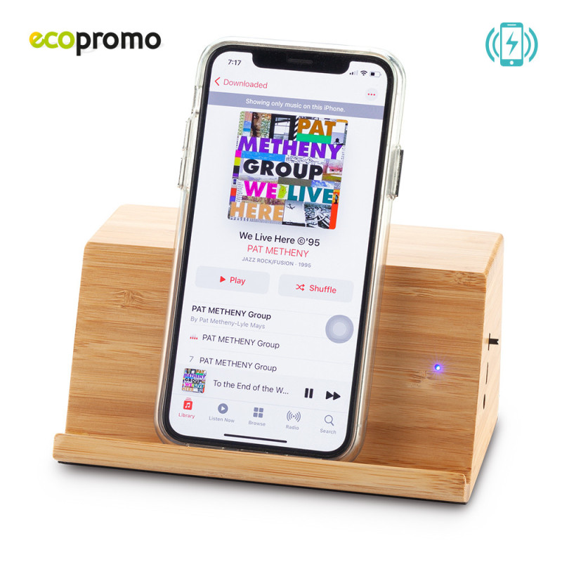 Speaker de inducción 2X3W, no necesita conexión bluetooth, con porta celular y cargador inalámbrico de 10W incorporado. Empaque caja individual.