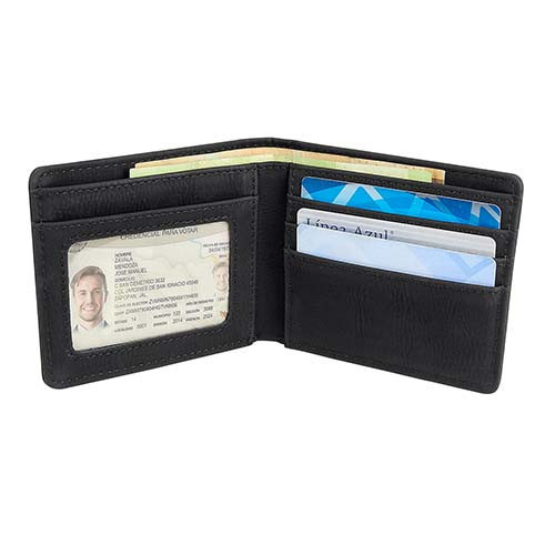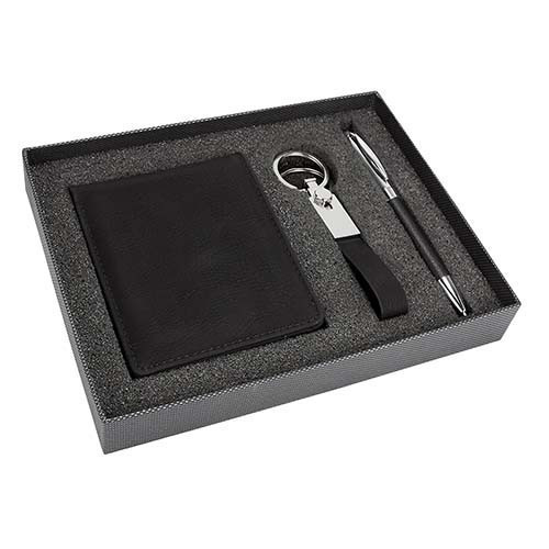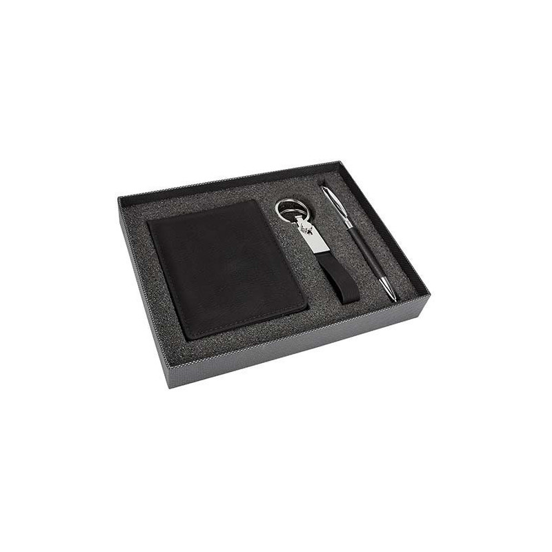 Incluye bolígrafo, llavero, cartera con organizador de tarjetas, credenciales, compartimento doble para billetes y caja de regalo.