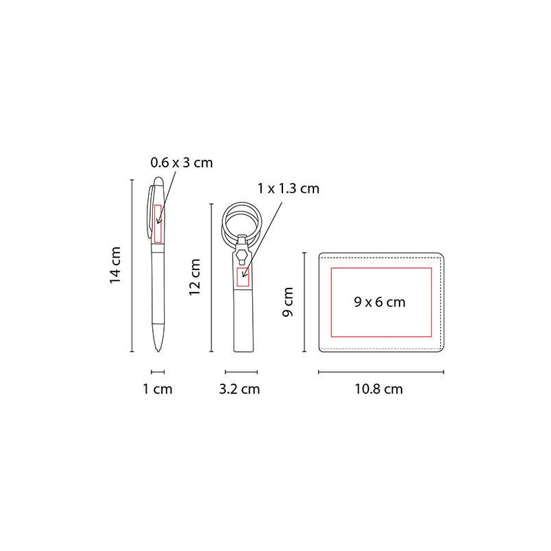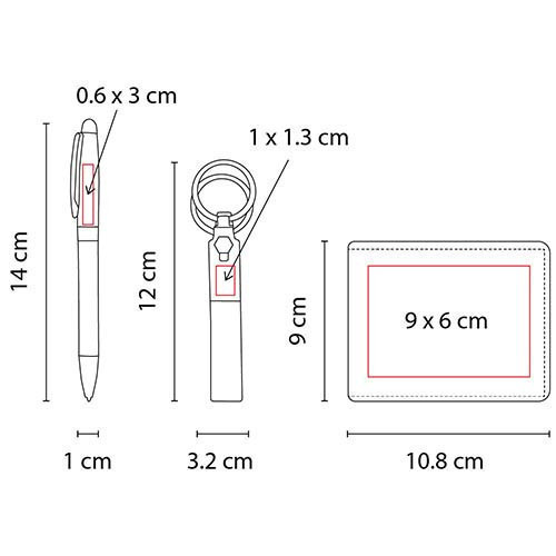 Área de impresión: 1 x 1.3 cm Llavero / 0.6 x 3 cm Bolígrafo / 9 x 6 cm Cartera