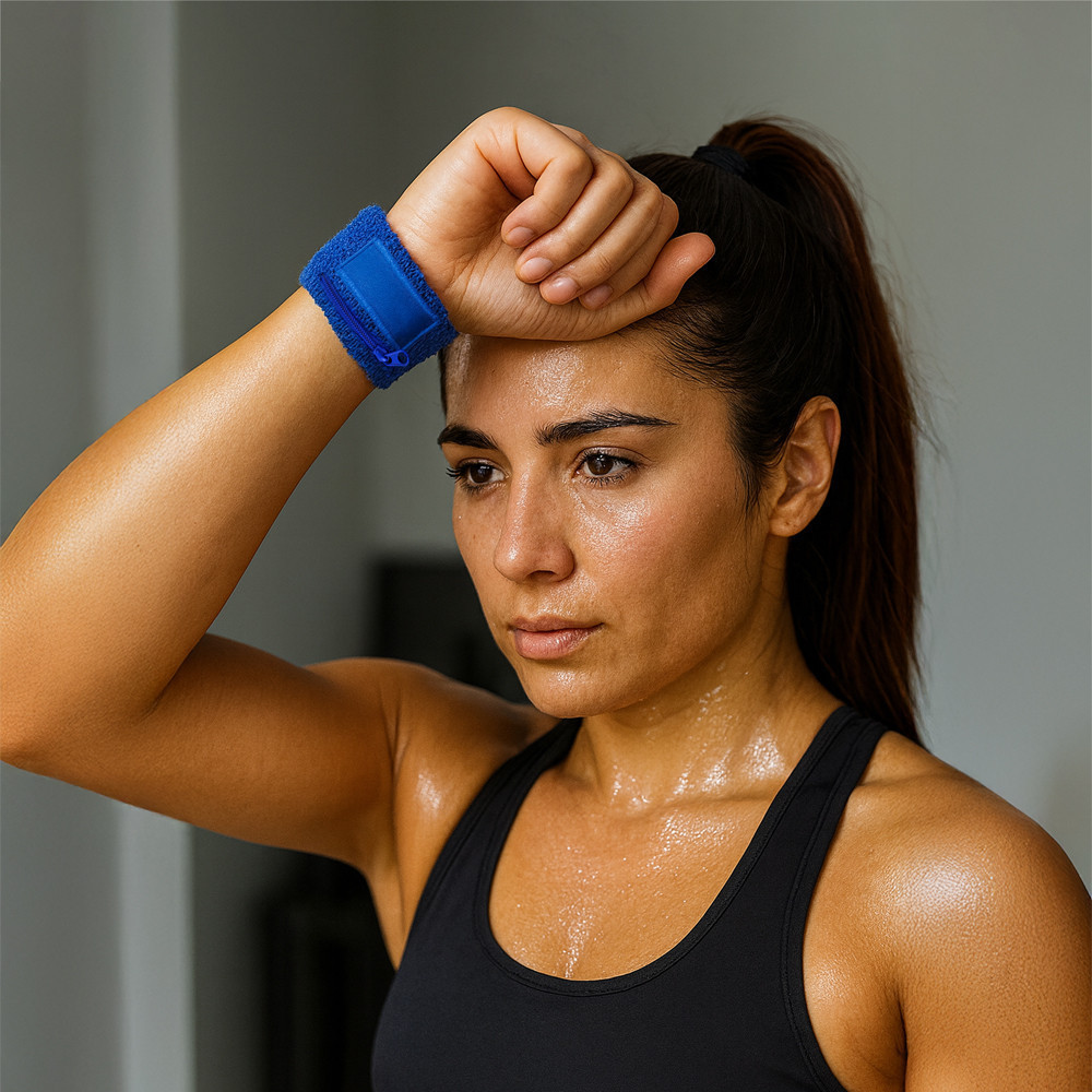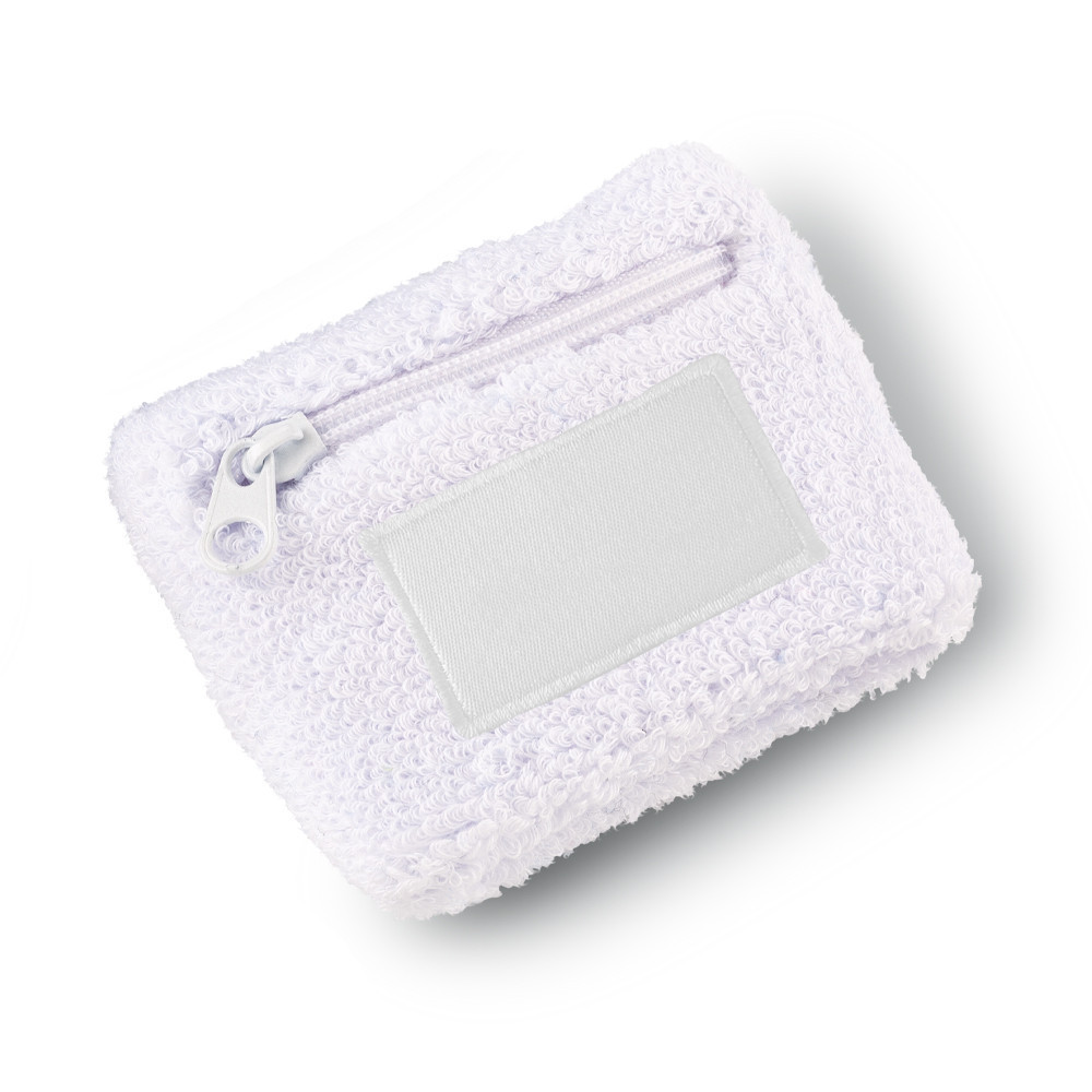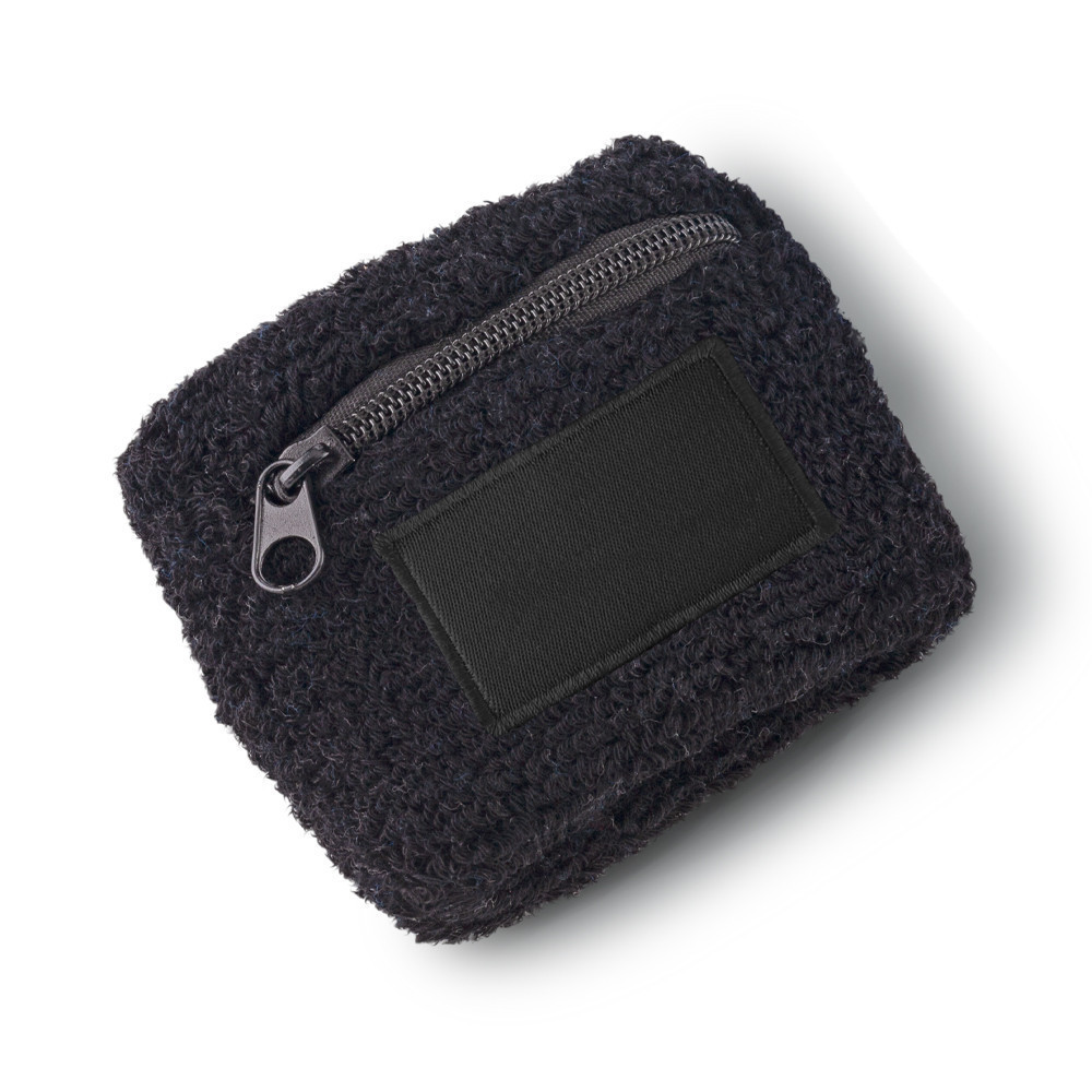 Muñequera deportiva para el sudor en poliéster. Incluye un bolsillo con cremallera y parche para el logo.