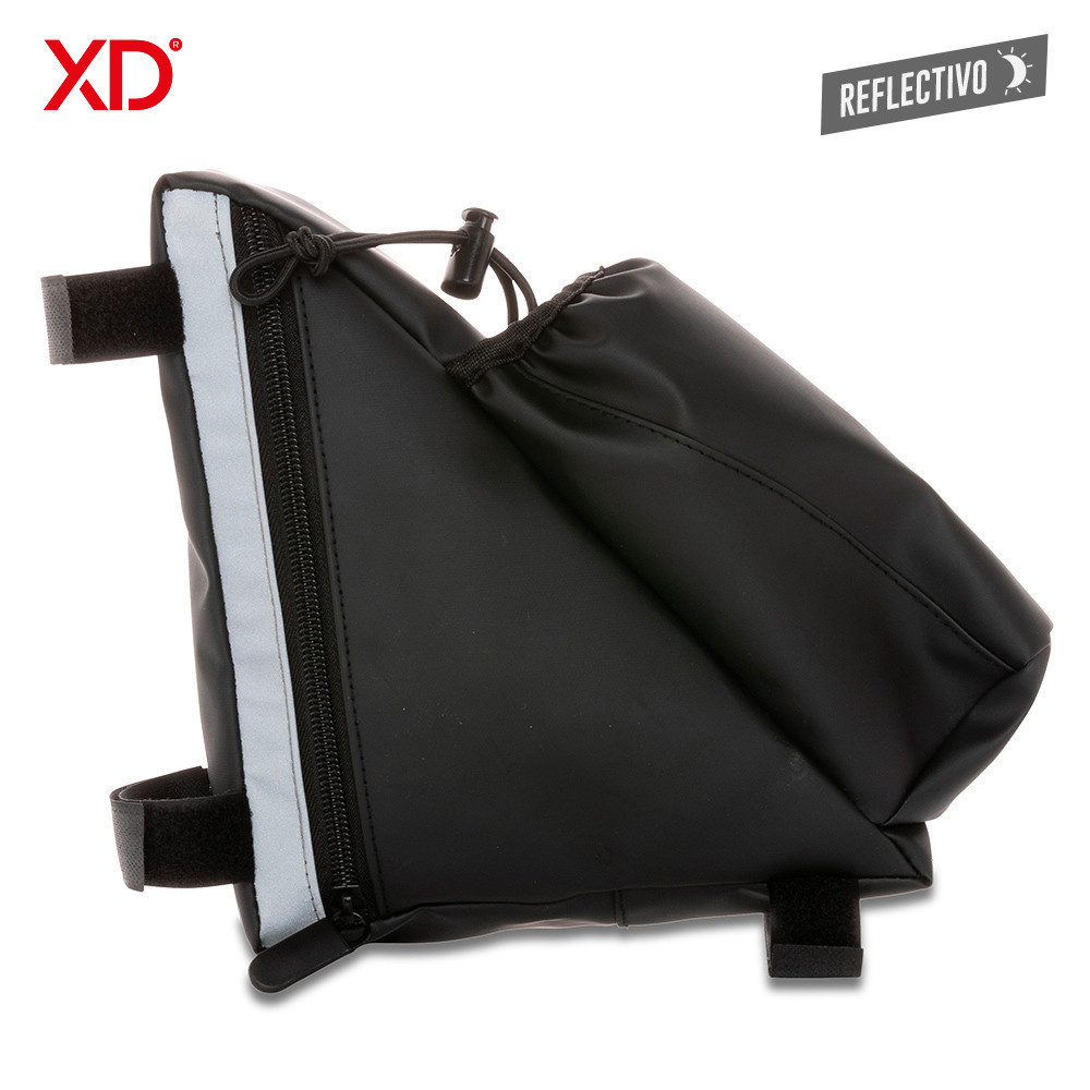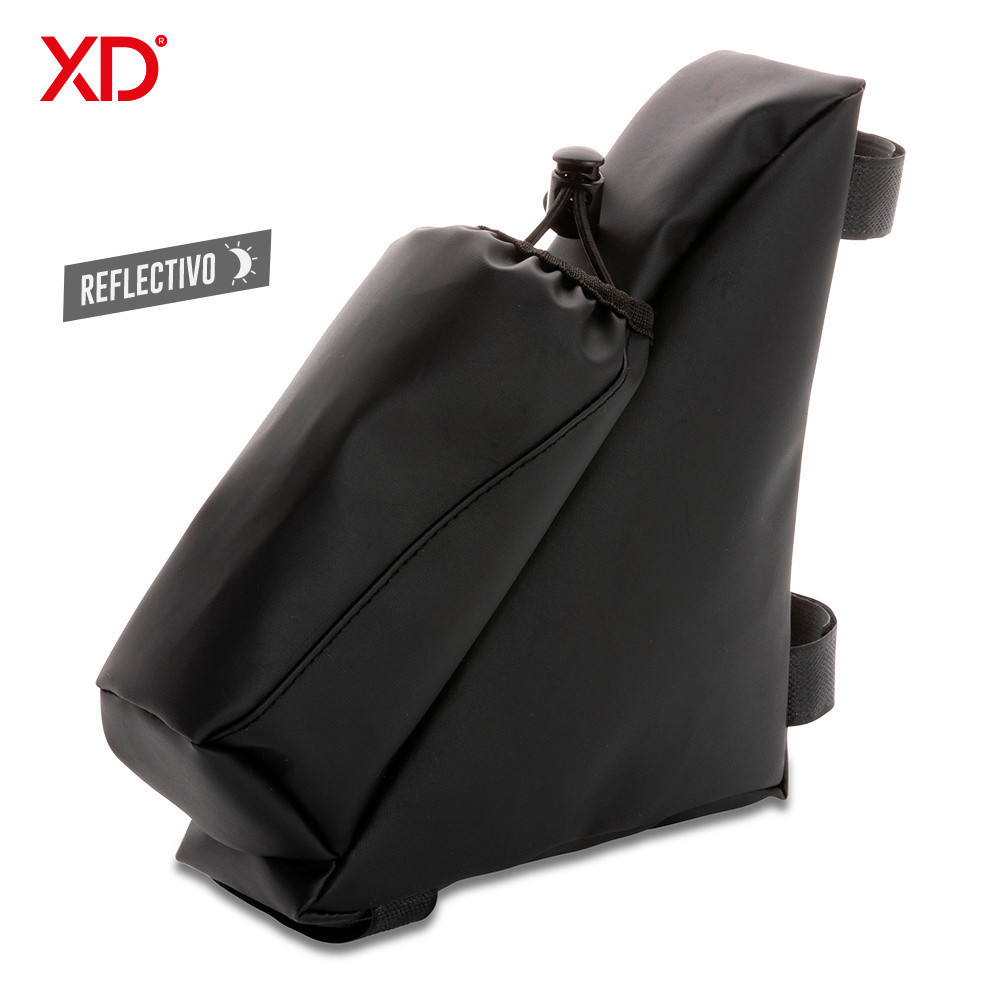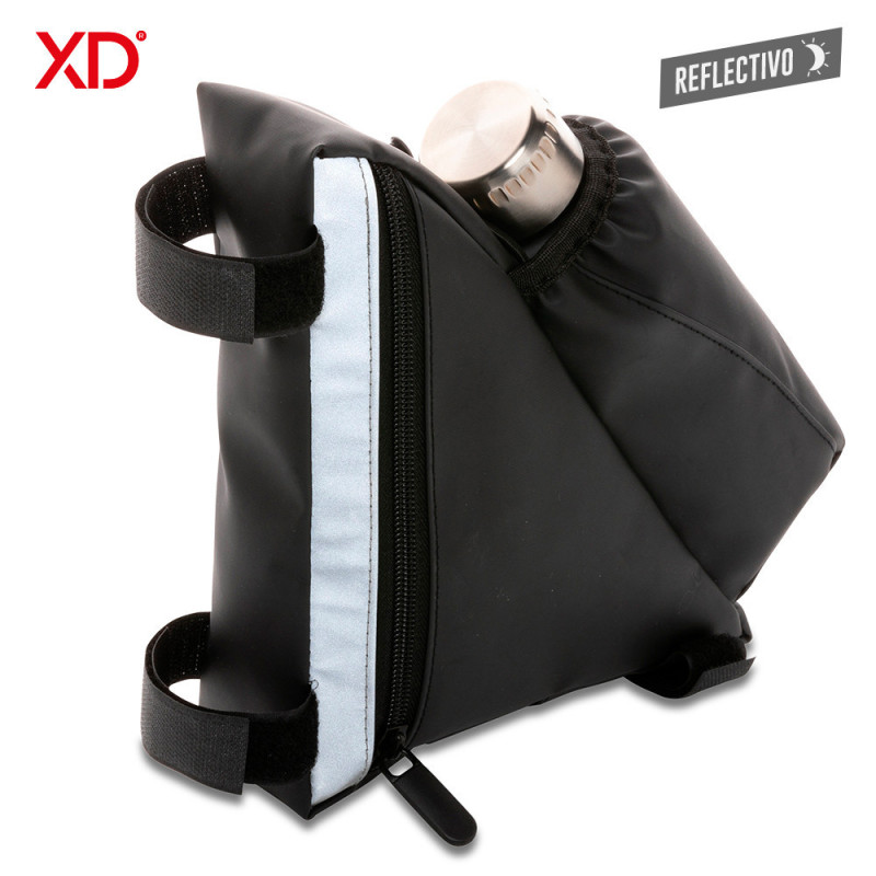 Organizador en poliuretano para bicicleta, con sujetadores en velcro y bolsillo para botella de agua. Resistente al agua (no sumergible), con aplique reflectivo.