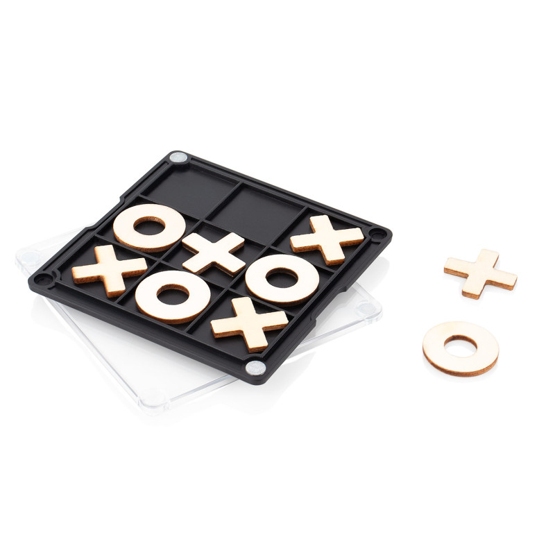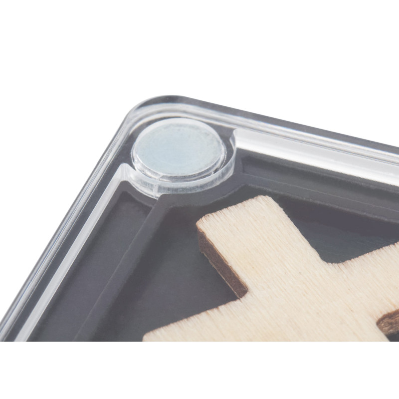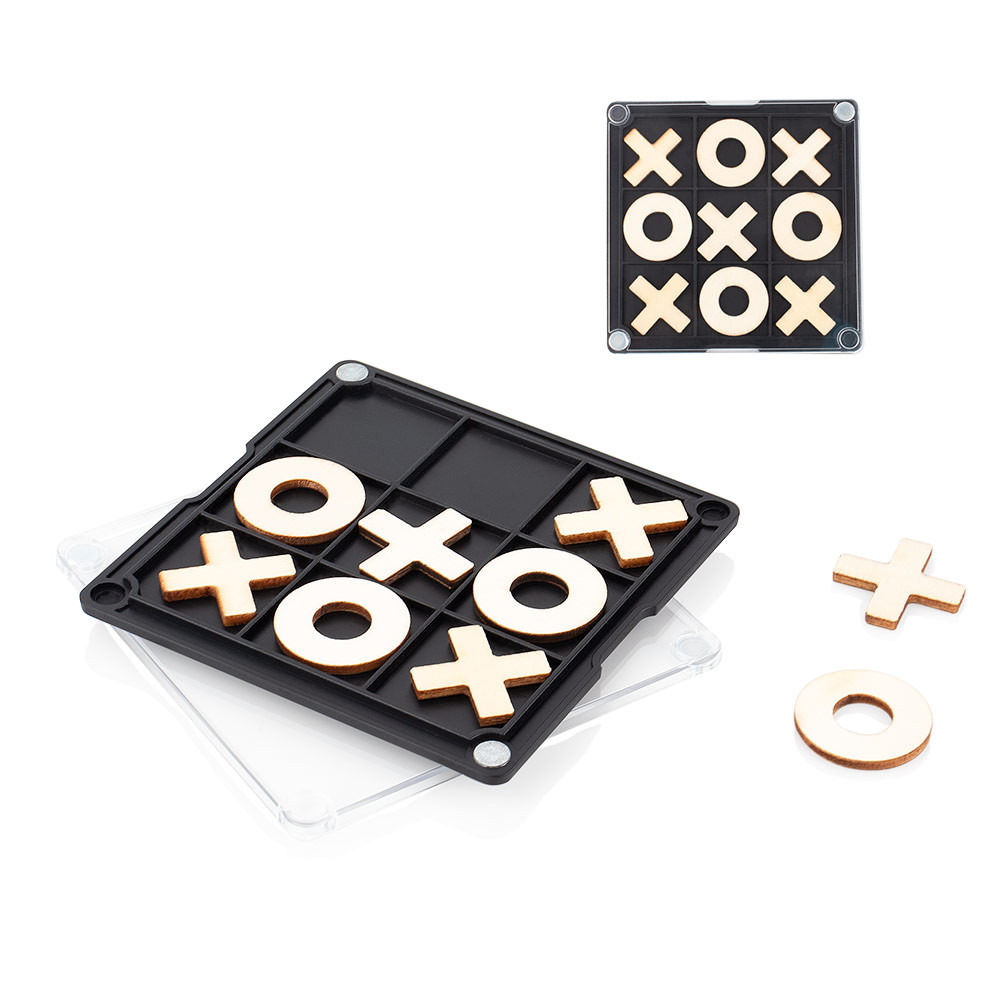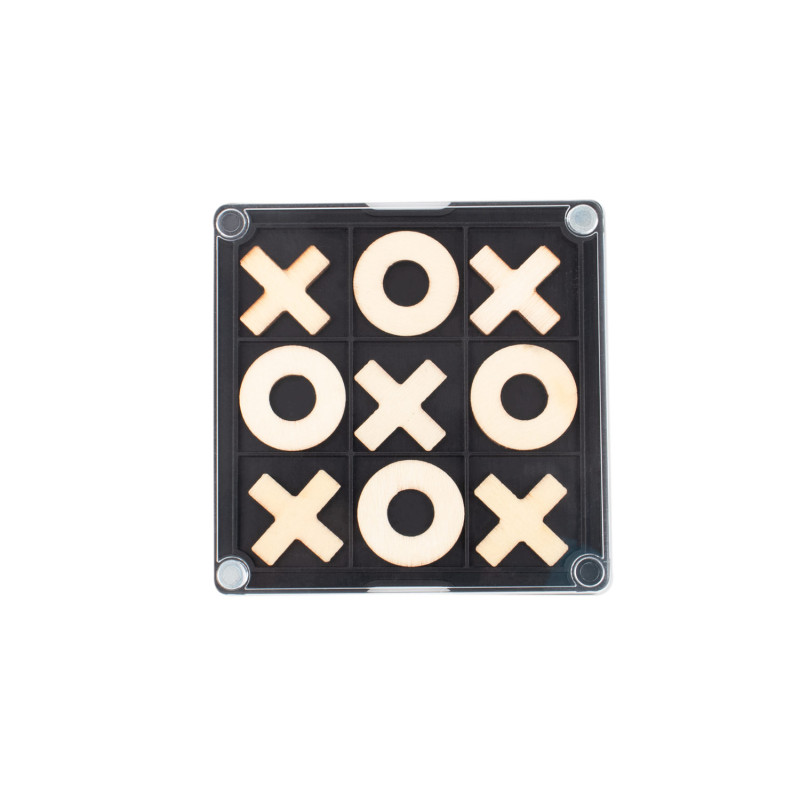 Portavasos de plástico con esquinas imantadas que permiten fijarlo a superficies metálicas; en su interior incluye un juego de triqui de madera con piezas con forma de “X” y “O” (2,2 X 2,2), ideal como accesorio decorativo y funcional para escritorio o espacios de entretenimiento.