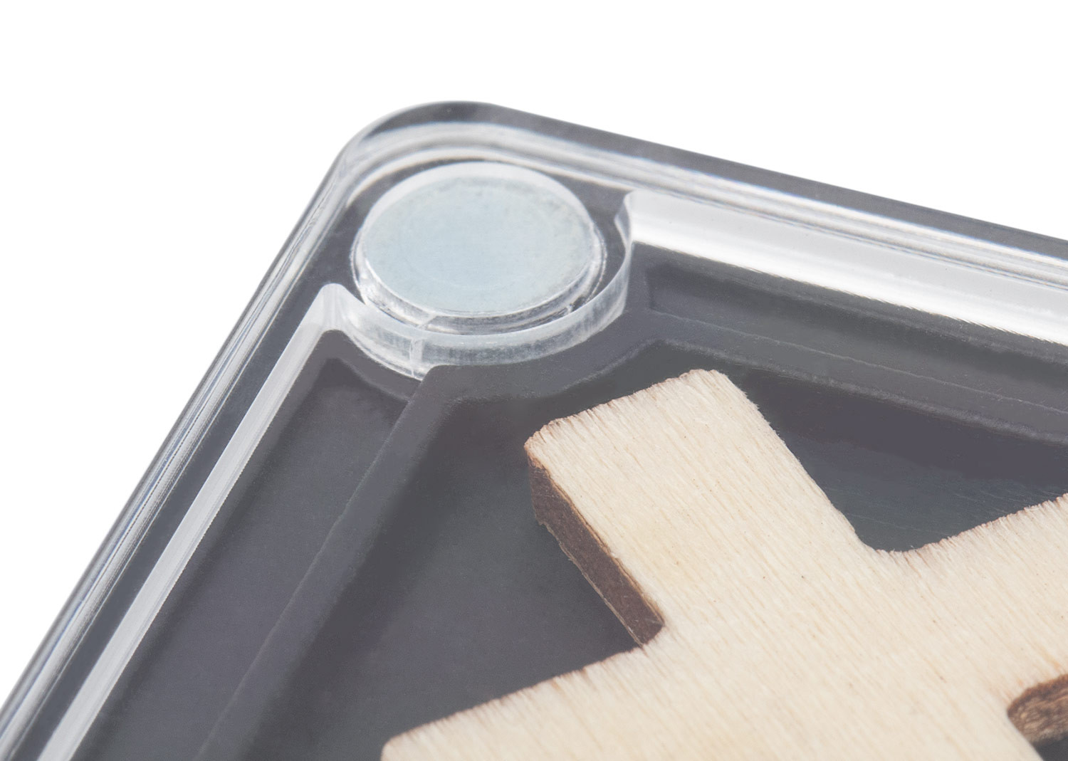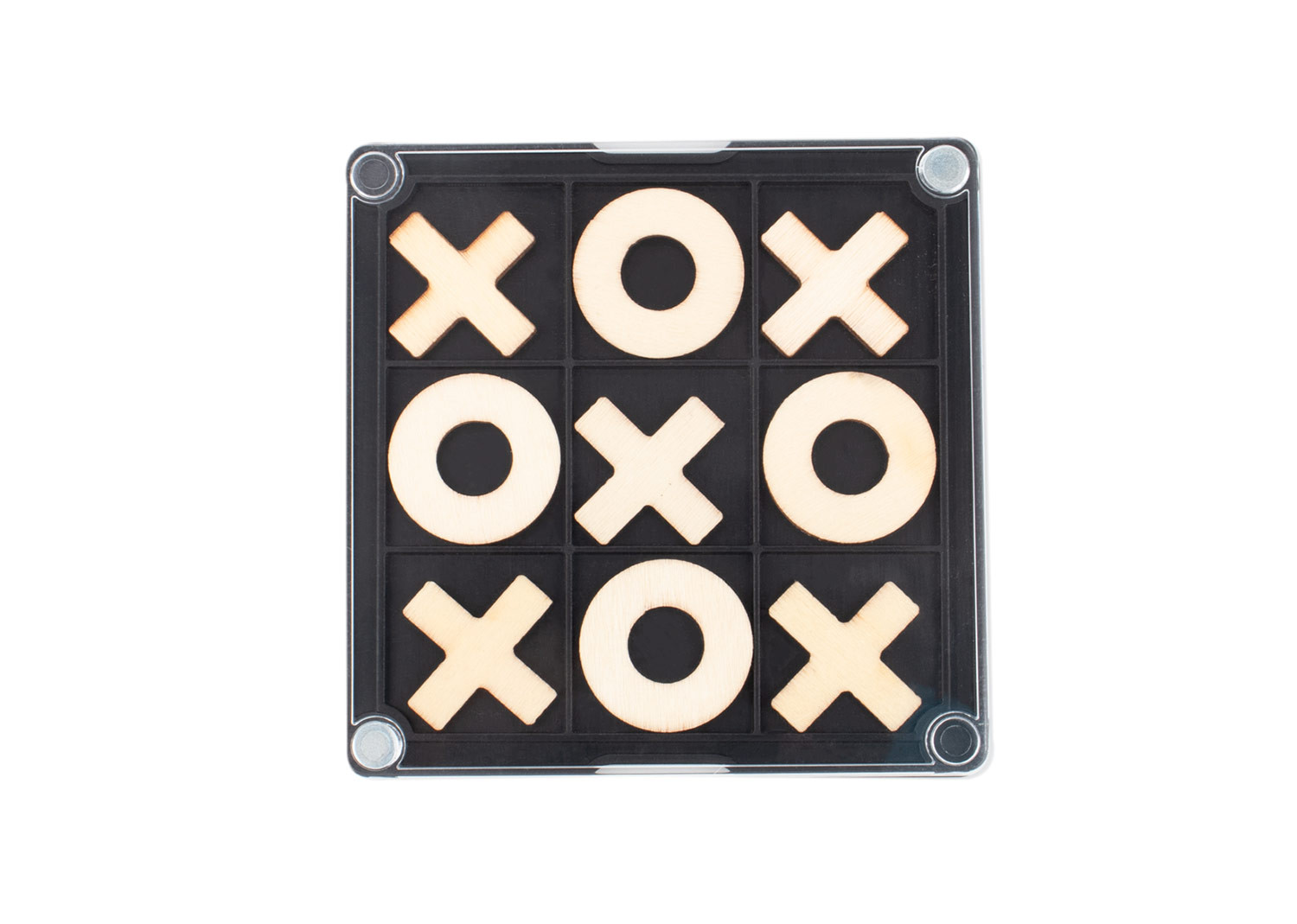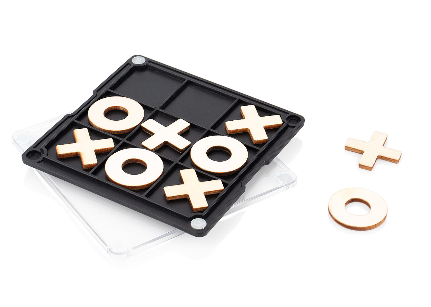 Portavasos de plástico con esquinas imantadas que permiten fijarlo a superficies metálicas; en su interior incluye un juego de triqui de madera con piezas con forma de “X” y “O” (2,2 X 2,2), ideal como accesorio decorativo y funcional para escritorio o espacios de entretenimiento.