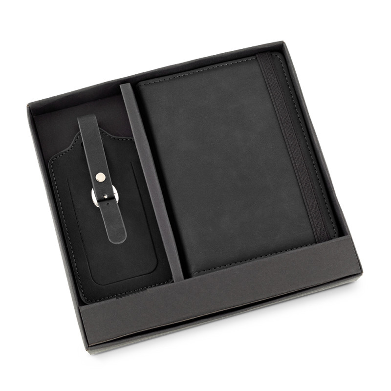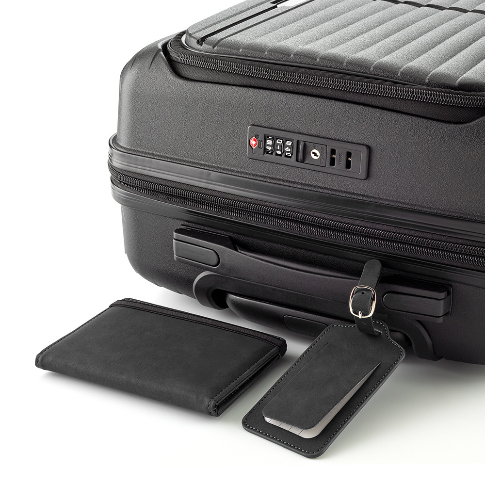 Set de portapasaporte e identificador de maletas en poliuretano. Con 4 portatarjetas, un portadocumentos y dos porta SIM (no incluidas). Empaque Individual.